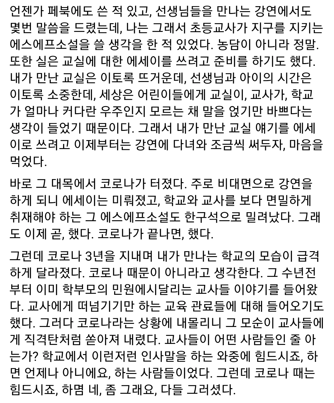 나는 이 글을 읽고 글이 사람에게 하는 일이란 이런 것이구나 분명히 느꼈다.
