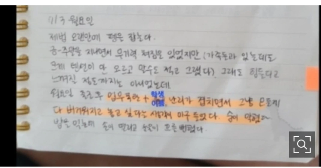 사망 2주 전에 작성된 고인의 일기장 일부가 공개되었다.
