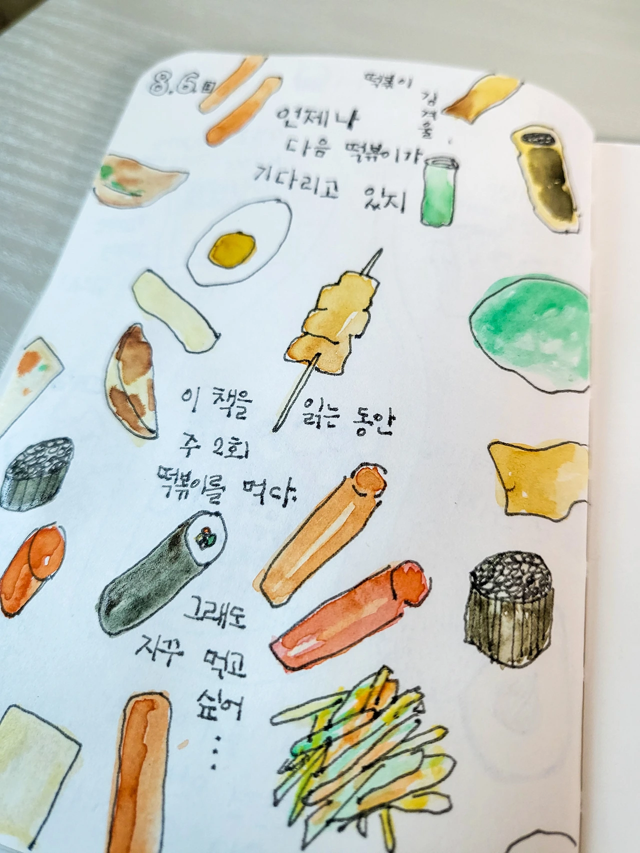 책을 다 덮고 나서 그림을 그리는 동안에도 침이 고이고 지금 이 글을 쓰는데도 침이 고이니, 나도 심각한 떡볶이 중독자이다. 사실 종류만 좀 바꾼다면 떡볶이는 나에게 매일 먹어도 무방한 음식이다.