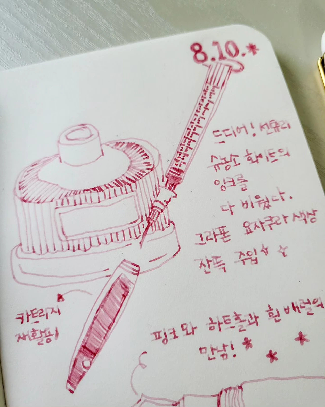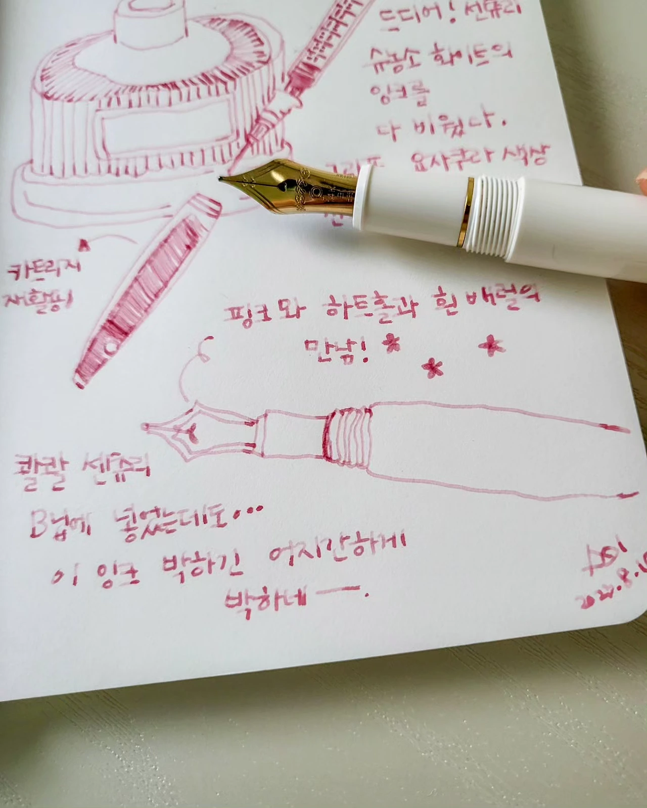 다시 잉크 주입으로 돌아가서 주사기는 잉크에 담기는 면적이 당연히 적고, 담을 잉크의 양을 조절하기도 좋다. 닙을 담가 주입할 때는 닙 주변과 배럴을 닦아 내어야 하는 번거로움과 혹시 배럴의 색이 밝을 때 잉크에 물들까 봐 조마조마한 마음이 드는데 주사기를 이용하면 이 불안함에서 자유로울 수 있다.(물론 닙을 담근다고 해서 그 짧은 시간에 배럴이 착색되는 일은 없긴 했다.)