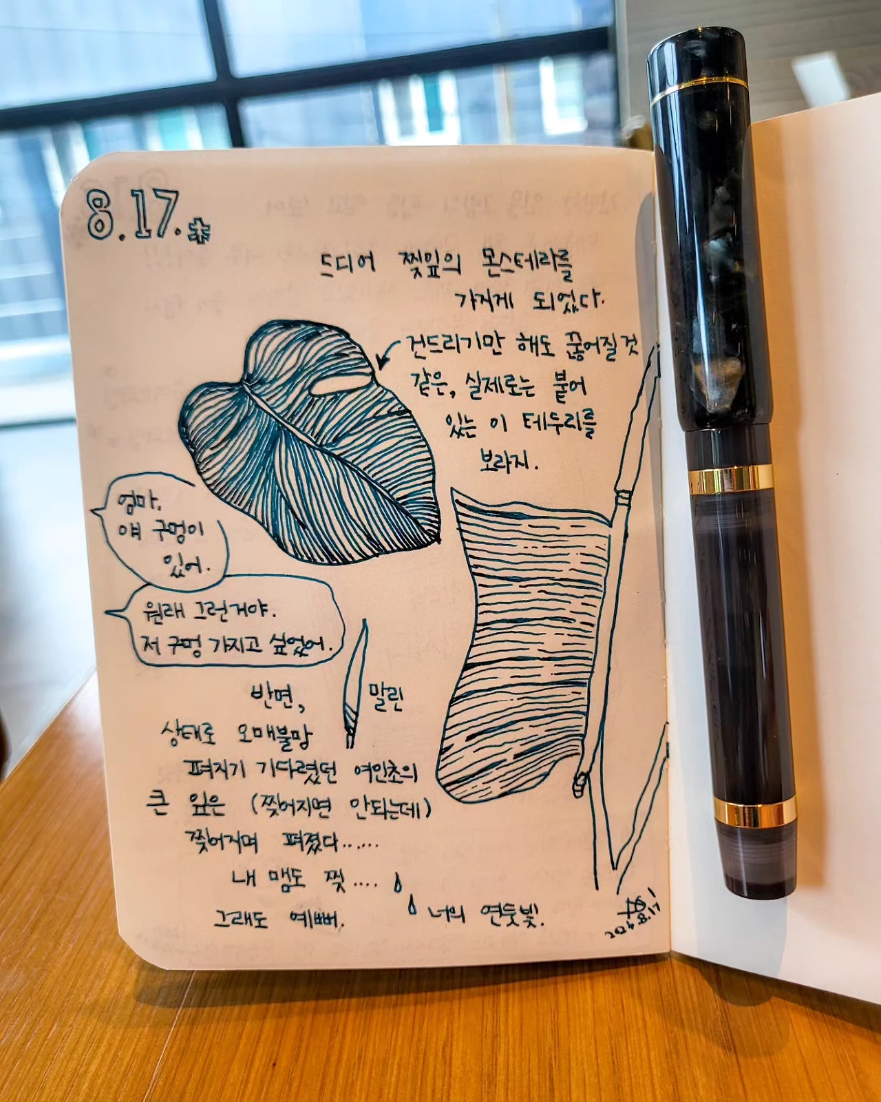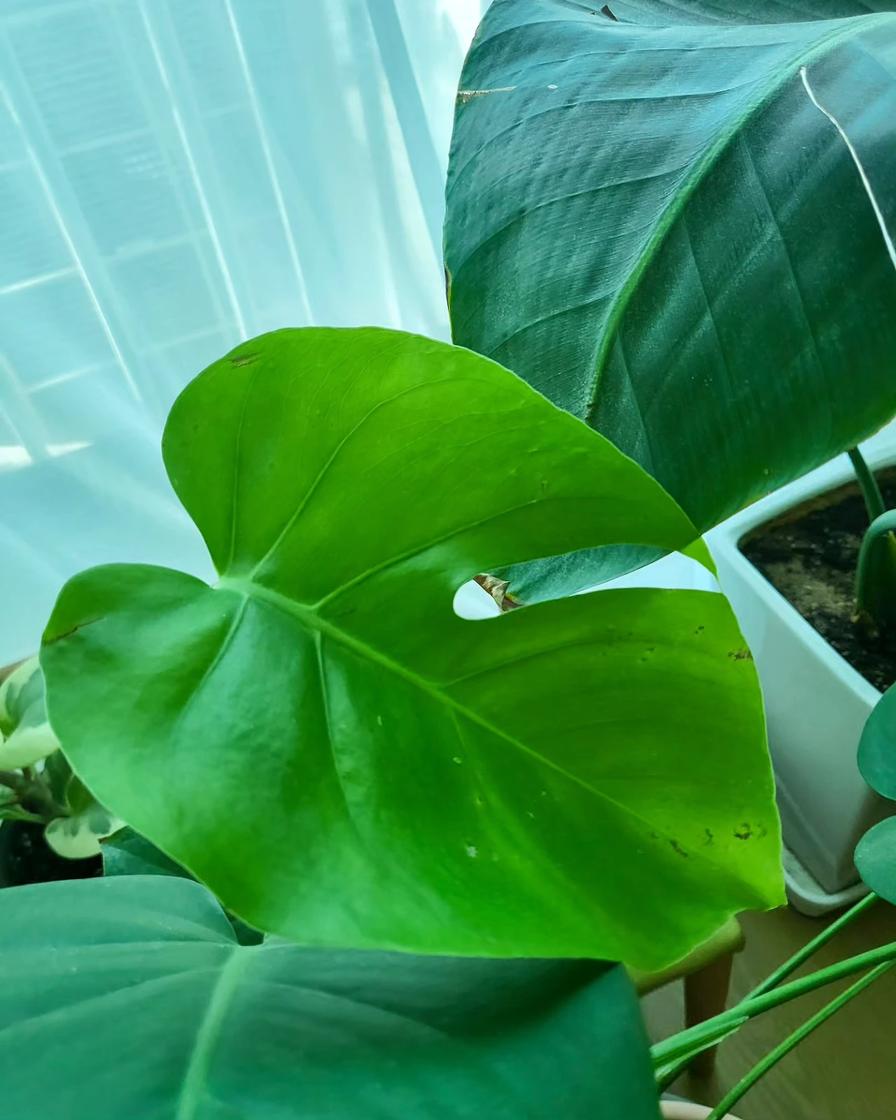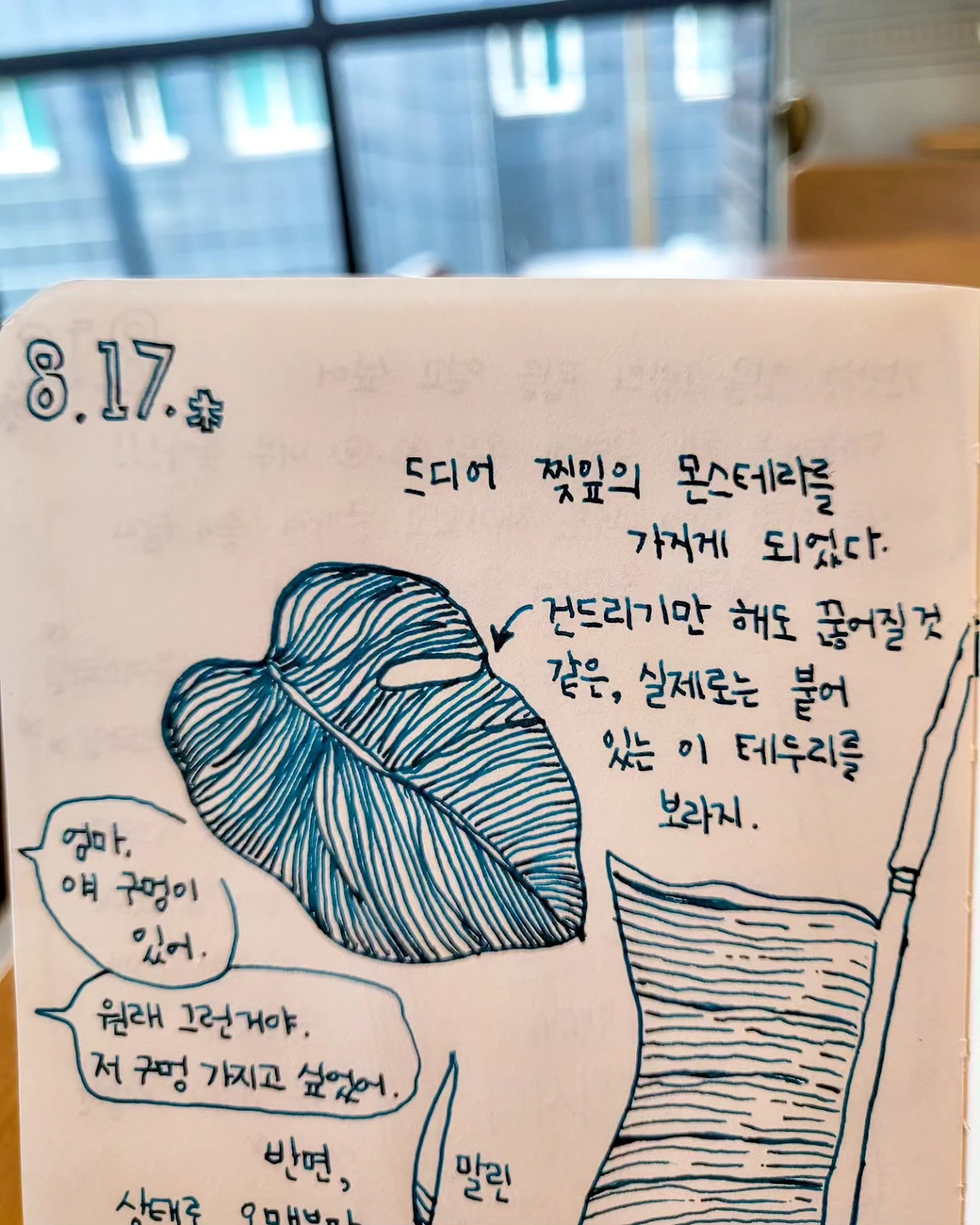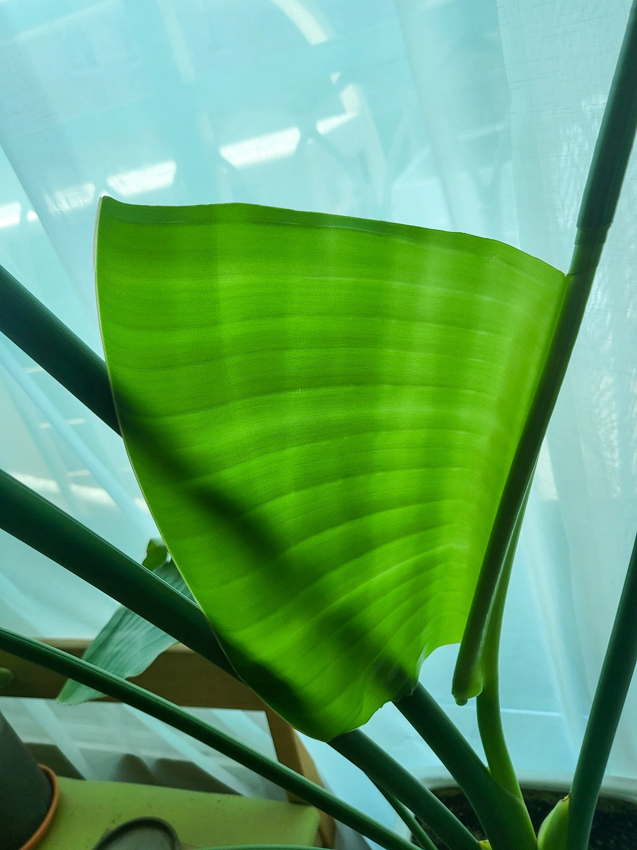 구멍 없는 잎만 가득했던 몬스테라는 드디어 구멍 있는 잎을 내주었다. 구멍이라 할 수 있는 것이 잎테두리에 간신히 작은 선이 있기 때문이다. 건들기만 해도 톡 찢어질 것만 같은 '선'이라고 부르기에 알맞은 테두리가 경이롭다.