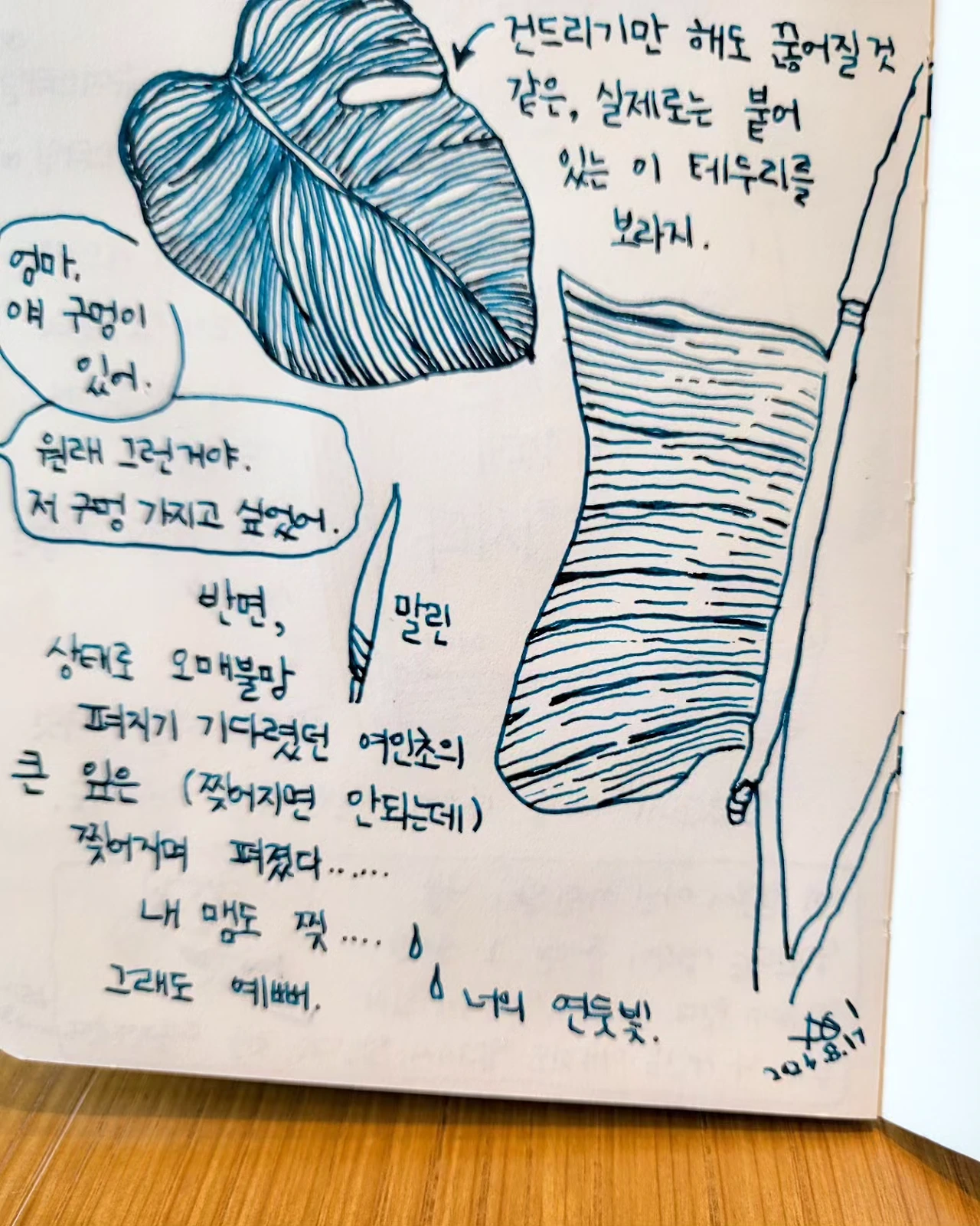 미안한 마음에 우리 집에서 가장 큰 여인초를 영차 화장실로 데려가서 물샤워를 시켜주고 잠시 뒤 가보니 똘똘 말려있던 잎이 스르르 펼쳐 여리한 속살을 보여준다. 찢어졌지만 찢어진대로도 여전히 아름답다. 다음에는 미리 촉촉하게 적셔줄게. 좀 더 수월하게 펴질 수 있도록.