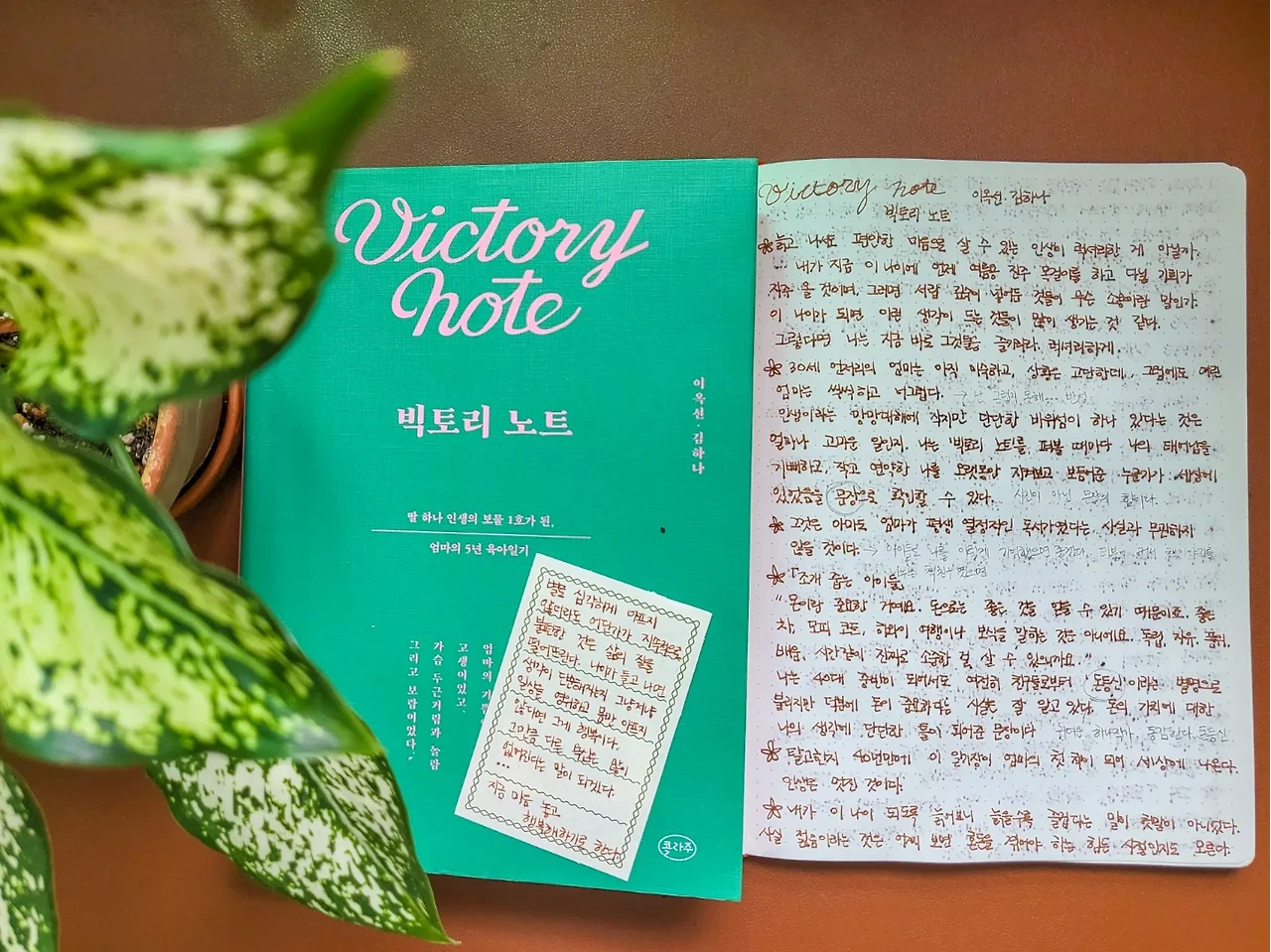 이옥선 작가는 5년까지 육아일기를 썼다가 스무 살에 주실 결심으로 두 아이의 육아일기를 써오셨고, 마침 노트 표지에 적힌 이름이 빅토리 노트였는데 이 이름이 책 제목이 되었다. 이 운명 같은 노트 이름이란!