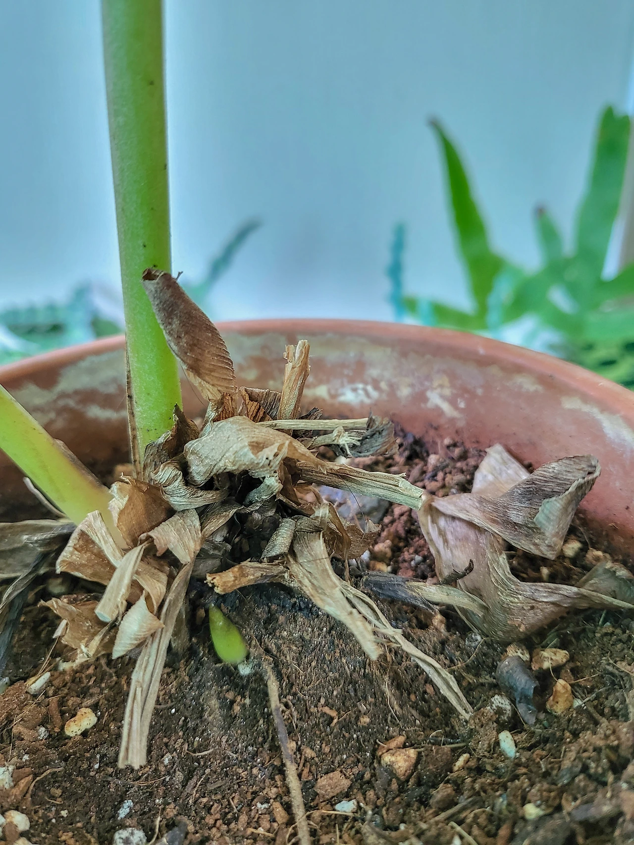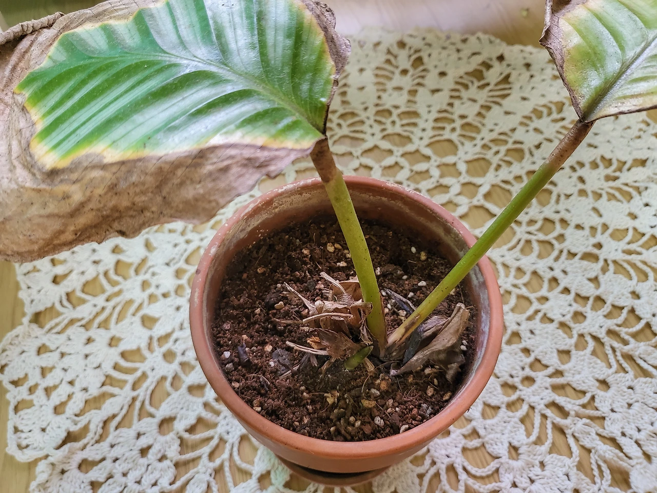 더디긴 하지만 기존의 잎이 말라갈 때쯤 신엽이 돌돌 말려 생명을 유지할 준비를 해주었기에, 어차피 풍성하게 자라기는 틀린 녀석이니 이렇게 근근이 키워내면 되지 생각이 자리 잡았다. 그렇게 잊혔다. 흙이 바싹 말랐을 때쯤 물을 주고, 어쩌다 신엽을 보면 반가워하고 또 잊고의 반복이었다. 과습을 주의하라는 말은 철저히 지켰고, 공중 습도를 좋아한다는 말은 나 편한 대로 잊고 살았다.