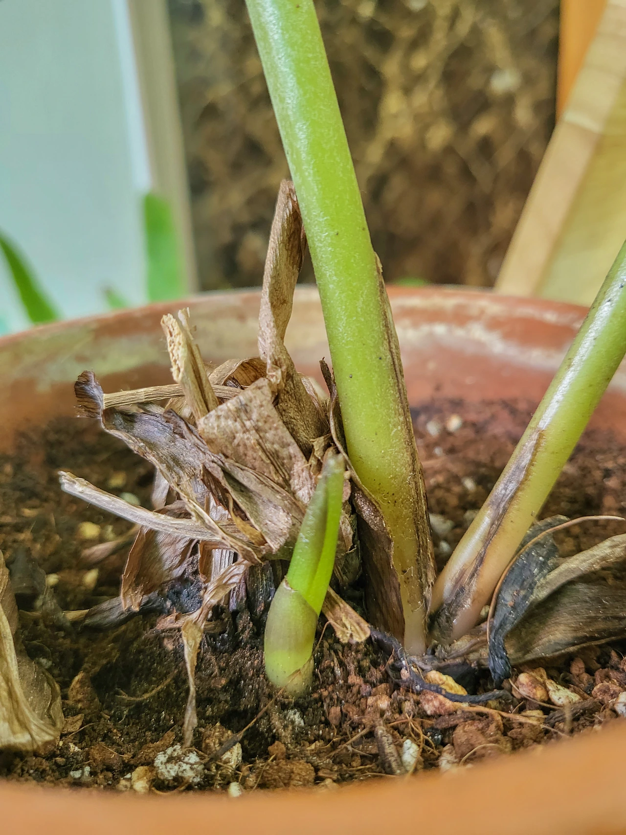 사진을 찍다 보니 무언가가 보였다. 원줄기 바깥쪽으로 흙을 뚫고 나온, 작은 뿔 모양의 촉이었다. 자세히 보니 하나가 아니었다. 둘이었다.