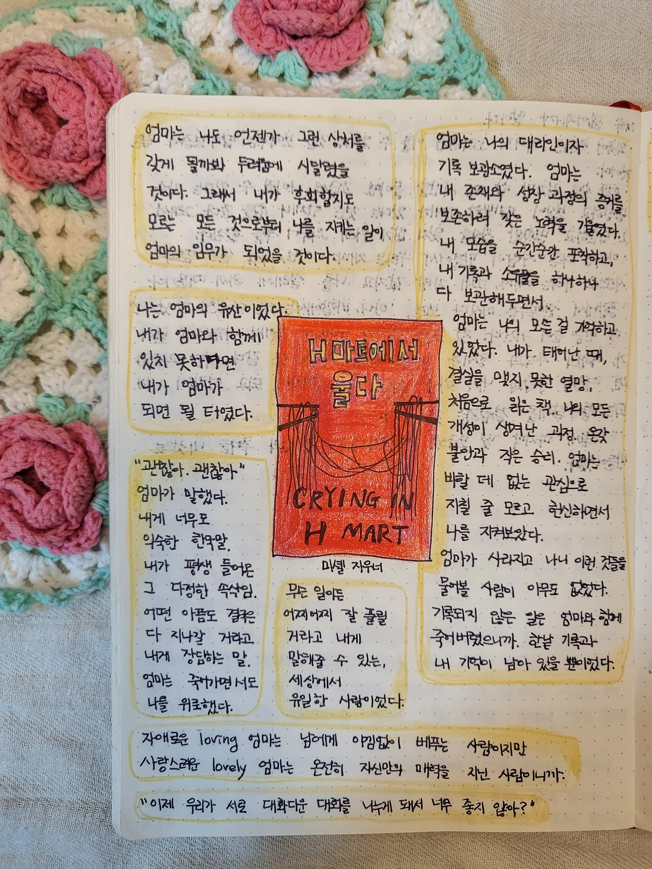 이제 나는 딸인 동시에 엄마가 되었다. 이 혼재된 역할 속에서 <h마트에서 울다>를 읽는 것은 훨씬 심적으로 버거웠다. 문장이 읽히지가 않는다는 것이 아니라 감정적으로 힘들었다는 이야기이다. 어떤 문장은 딸의 입장에서, 어떤 문장은 엄마의 입장에서 읽었다. 그것은 내가 의식해서 되는 것은 아니었고 문장에 따라 저절로 제 나름대로 방향을 잡고 흘러갔다.