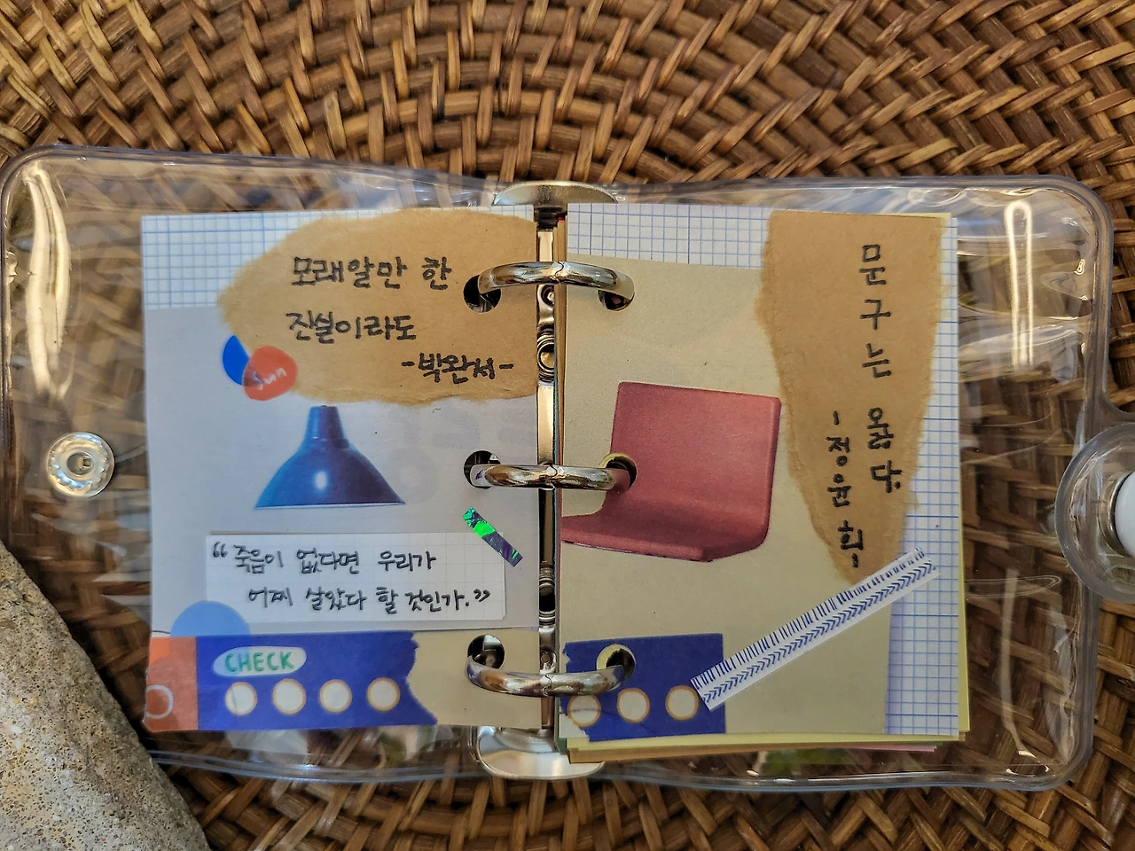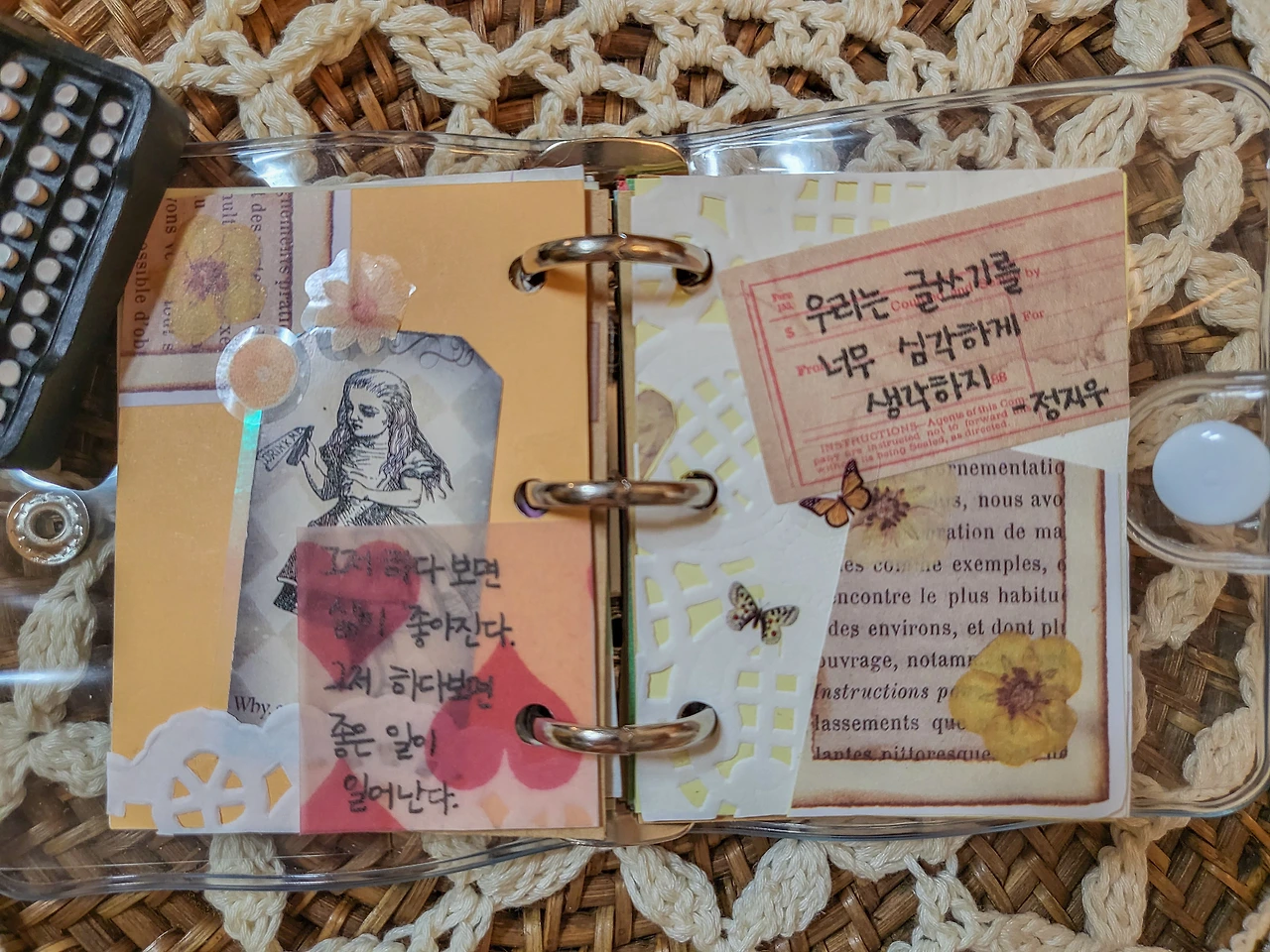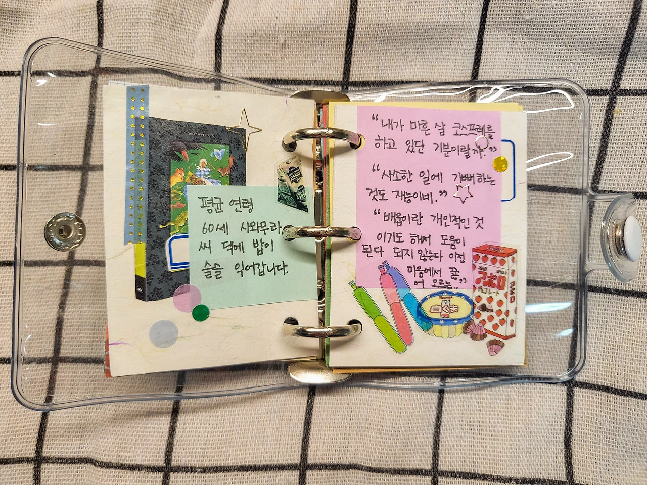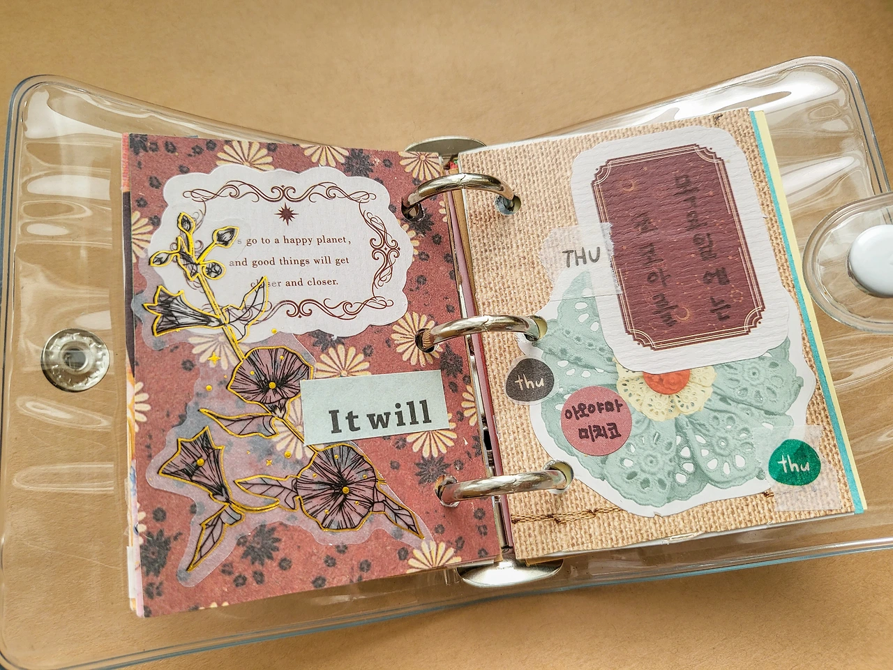 "그렇지? 왜 하는지 정말 모르겠지? 나도 정말 왜 하는지 몰랐거든? 나는 그래도 글씨라도 쓰지 종이와 스티커만 잔뜩 붙이는 다꾸들이 대다수야. 특히 스티커 위에 또 스티커를 붙여서 이미 붙인 스티커는 가려서 반쯤은 보이지 않을 때도 있어. 너무 아깝지? 정말 정말 왜 붙이고 있는지 몰랐거든?
