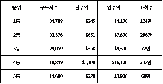 1등부터 5등까지 뽑아봤는데 연수익 금액은 구독자수보다는 조회수가 더 많은 영향을 주는 것으로 보였다.