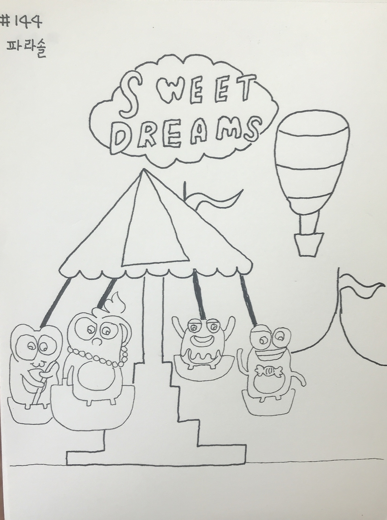 의자에 매달린 각종 간식을 스케치하고 나서 색연필을 들었다.