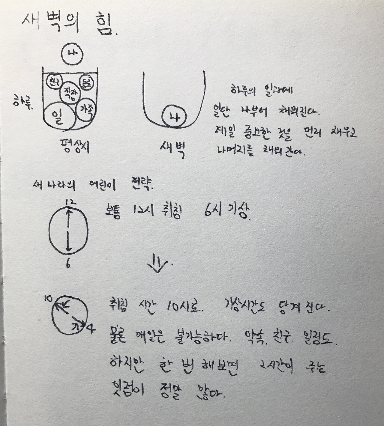 하지만 하루, 이틀 성공의 수레바퀴가 굴러가면 언젠가는 자연스레 새벽에 일어나는 나를 볼 수 있지 않을까?