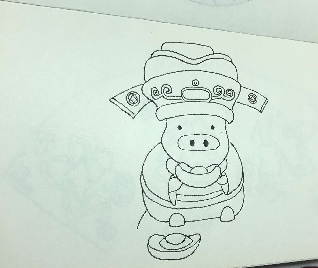 어느 상점 앞에서 본 황금 편자를 든 돼지.