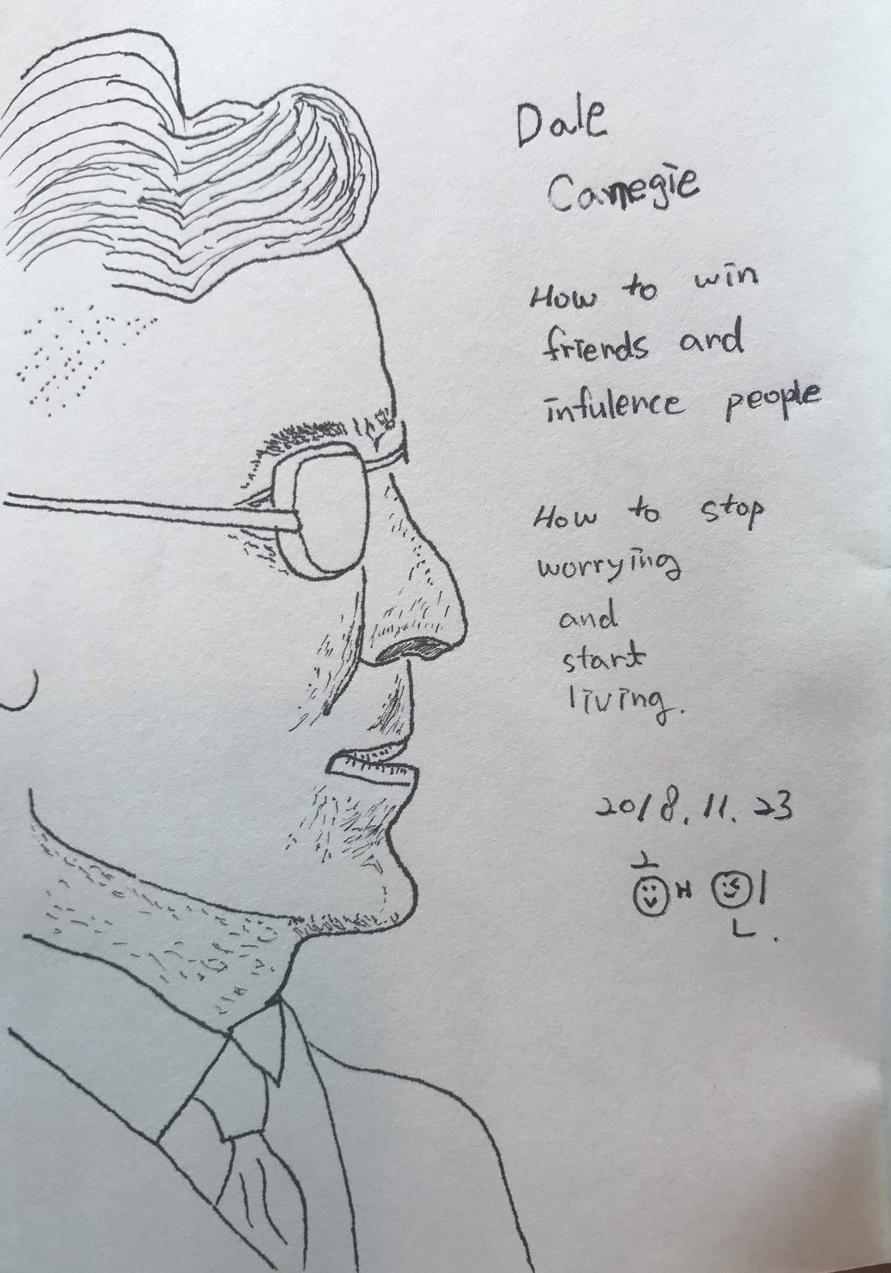 데일 카네기의 그림에서 주름은 거의 없이 그렸다. 카네기의 나이와 상관없이 그렇게 나이가 든 느낌은 들지 않는다.
