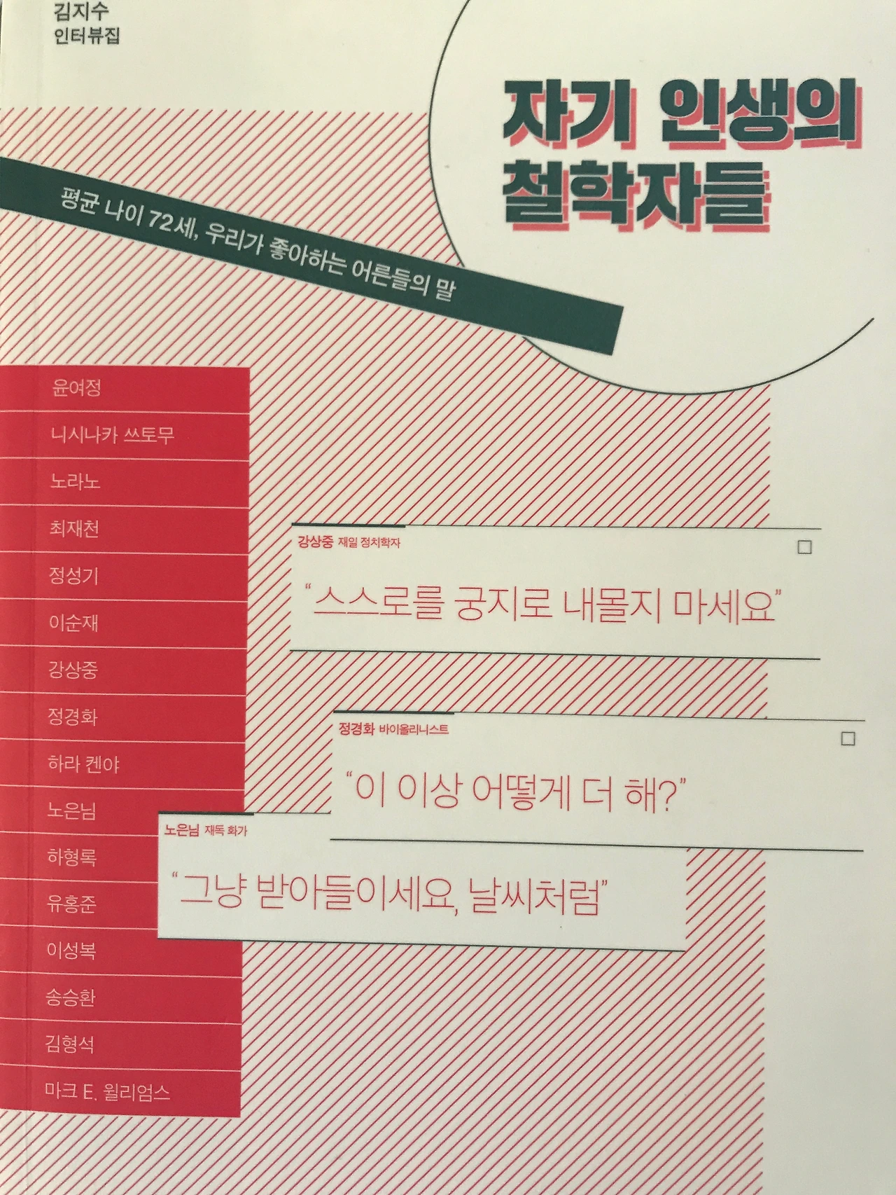 평균 나이 72세의 이 시대 어른들. 그들은 어떤 고민을 하고 있을까? 그들의 말에서 인생의 답을 조금이나마 찾을 수 있지 않을까 싶어 이 책을 들었다. 인생에 정답은 없겠지만 그래도 그들에게서 일말의 힌트는 찾을 수 있었다.