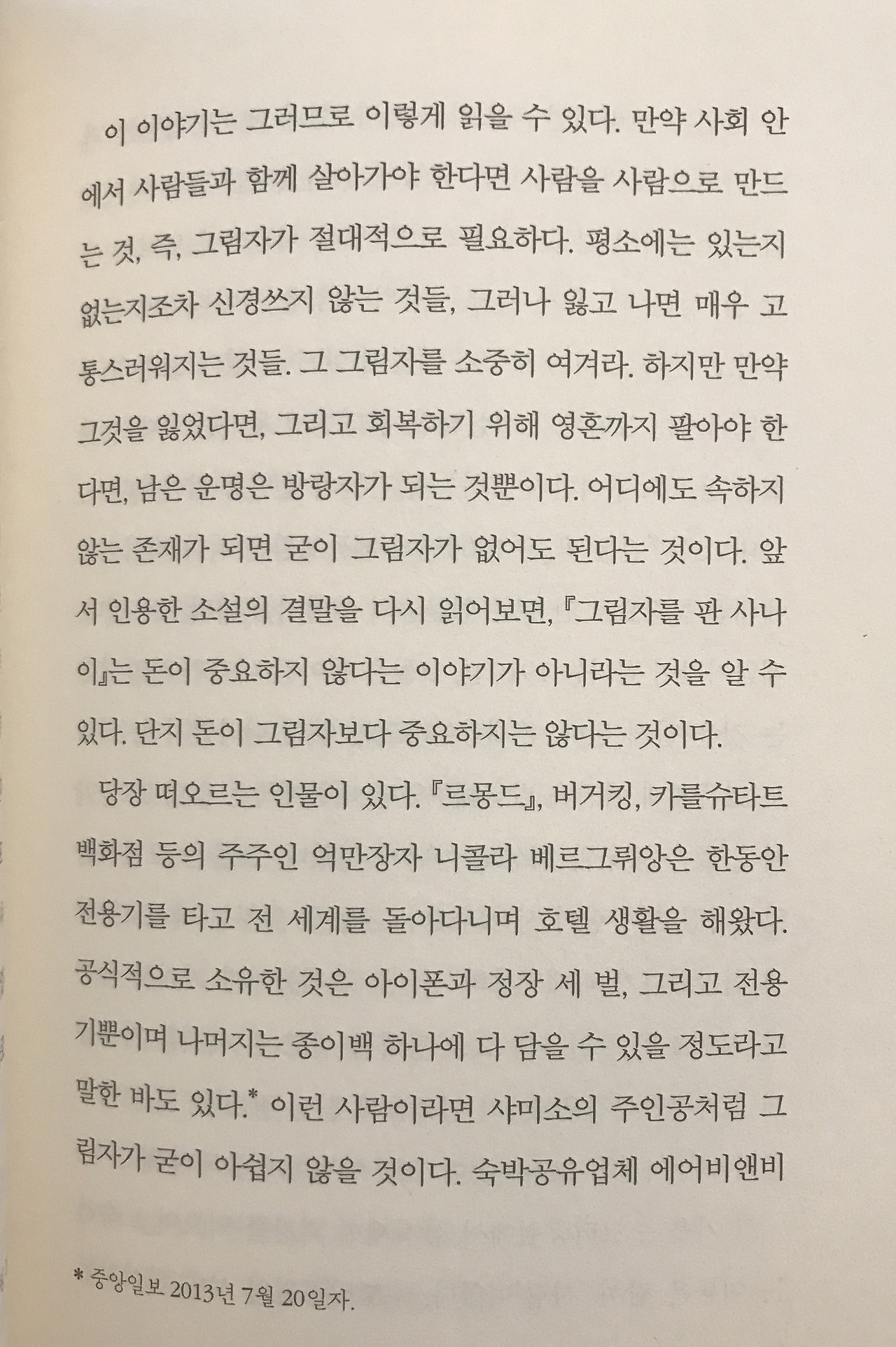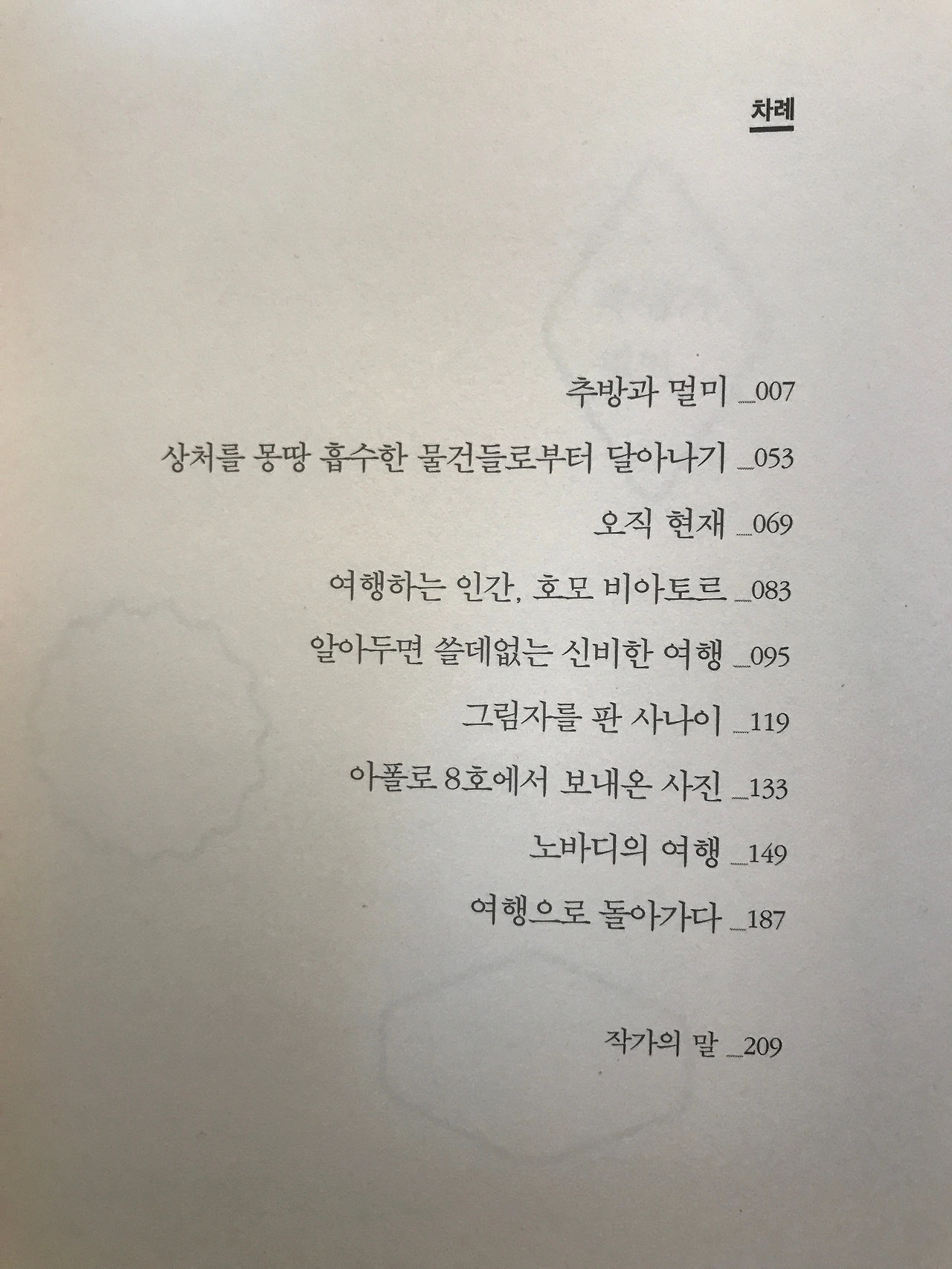 “그림자를 판 사나이"라는 소설은 읽지 못했다. 저자는 친절하게 주요 줄거리를 소개하며 그림자라는 배경에 대해 이야기하고 있다. (내용이 재미있어 보여서 조만간 "그림자를 판 사나이"를 읽게 될 것 같다.) 여행이라는 방랑을 하는 순간에는 자신의 배경보다는 낯선 누군가로 남게 된다는 그의 이야기가 생각에 남았다. 현실에서는 누군가의 동료로 친구로 여러 가지 사회적인 관계로 엮여 있다. 하지만 여행을 떠나면 오롯이 자신이라는 하나의 존재로 남게 된다.