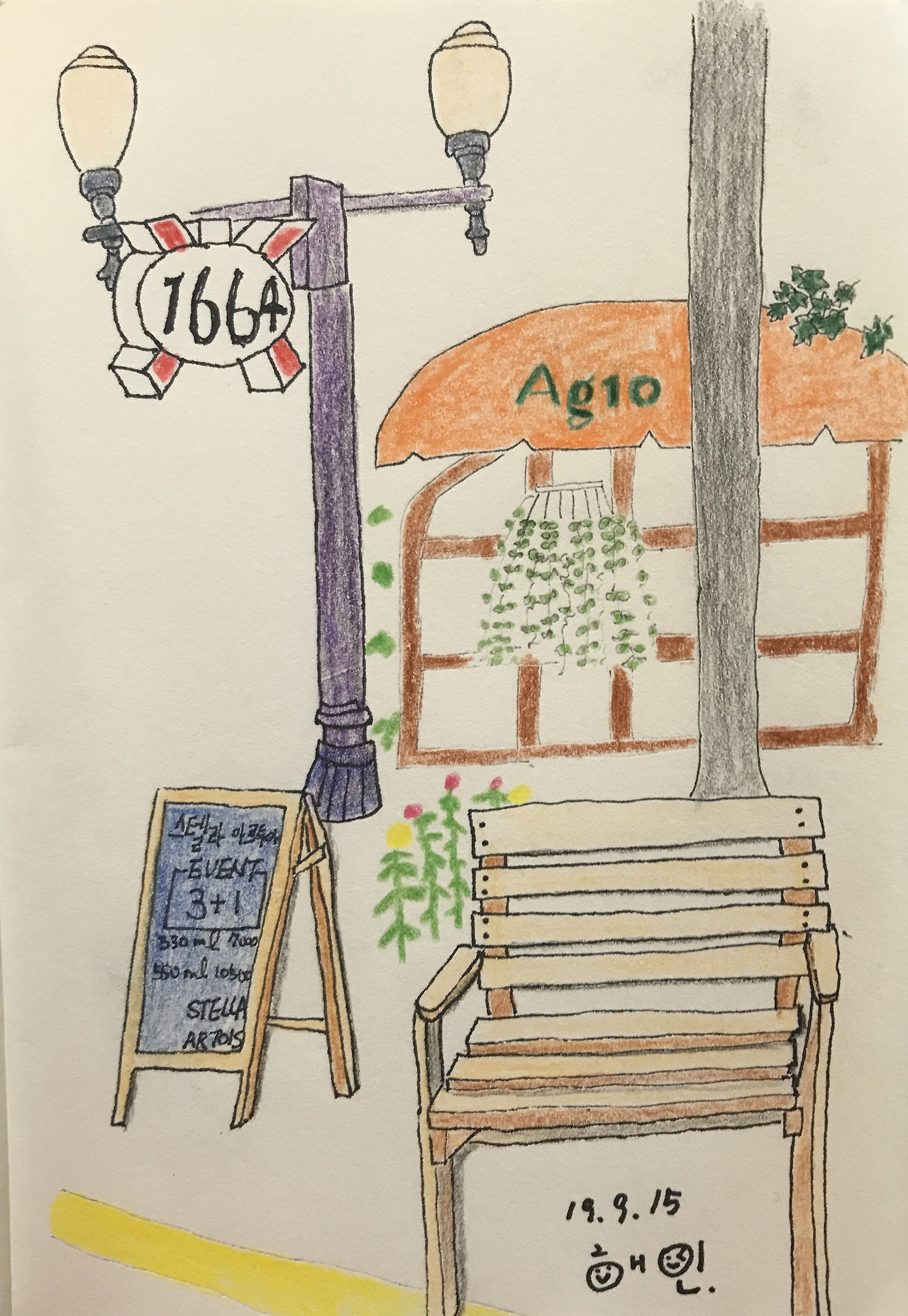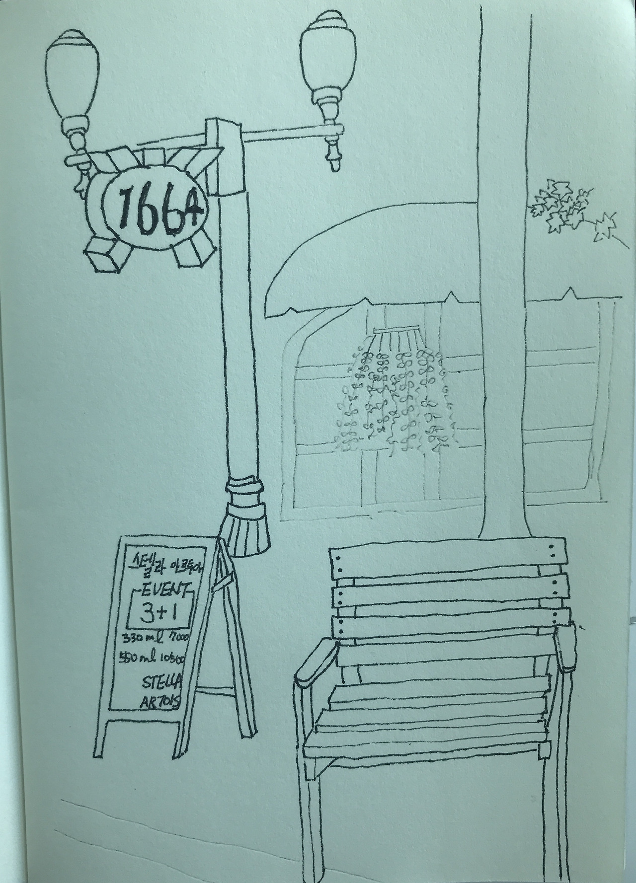 벤치부터 시작해 창문까지 그리다 보니 어느덧 펜이 수명을 다했다. 일부러 뒤쪽을 흐리게 그린 것이 아닌데 펜심이 떨어지며 흐리게 스케치되었다.