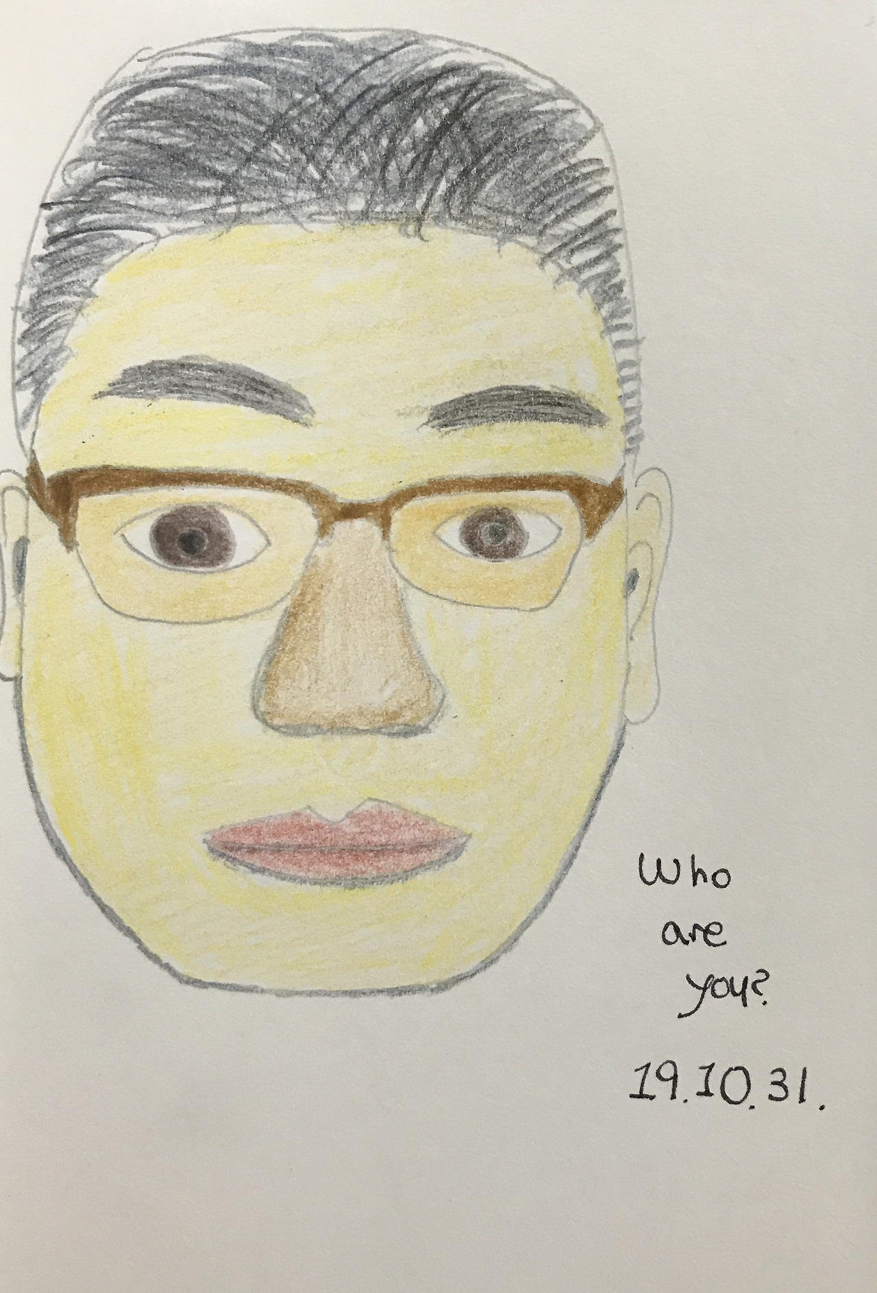 색칠하면 조금 나을 줄 알았는데 여전히 제3의 얼굴 같은 남의 자화상을 끝내다. 너는 누구니?