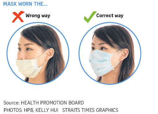 싱가포르 정부 자료를 찾아보니 역시 색깔 있는 쪽이 바깥이란다. 물론 코는 당연히 가려야 하겠지.