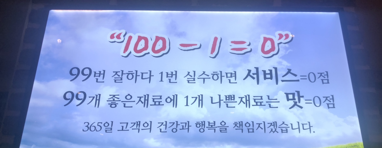음식을 내오는 종업원에게 물어보니 사장님의 방침이란다. “한 가지를 잘못하면 100가지를 잘해도 소용없습니다”