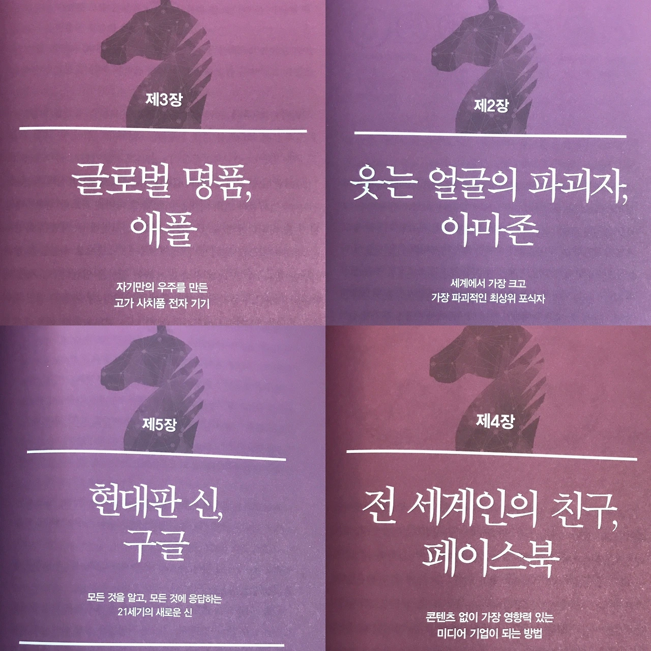 지금 현재 세계를 이끌고 있는 자체적인 플랫폼을 가진 기업으로 저자 스콧 갤러웨이는 4개의 회사를 주목했다. 애플, 아마존, 구글, 페이스북이다. 마이크로 소프트 역시 윈도우와 오피스라는 강력한 플랫폼을 가지고 있지만 저자는 앞선 4개의 기업보다는 뒤쳐진다고 생각해서 넣지 않았다.