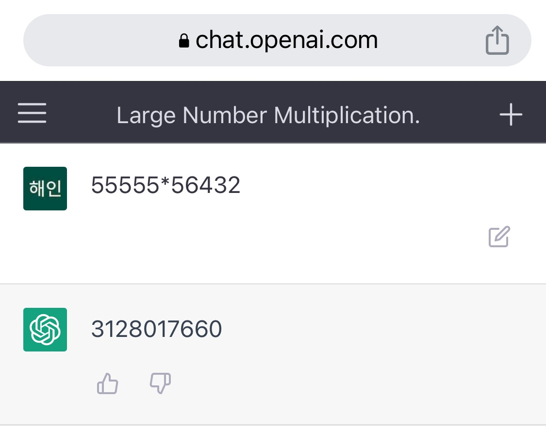 단점이라면 GPT는 계산기가 아니기 때문에 규칙에 기반한 것은 다를 수 있다. 예를 들어 수학에는 도움이 안 된다. 1+1=2가 되어야 하지 1이나 3이 될 수 있는 것은 아니다. 수학은 확률적인 게 아니라 규칙에 기반하는 것이기 때문에 Chat GPT가 도움이 되지는 않는다. 단순 검색으로 해서 찾는 것도 역시 큰 도움이 안 된다. (물론 단순 계산은 그래도 잘 계산해 낸다. 하지만 4자리나 5자리 곱셈은 정답이 아닌 다른 답이 나온다.)