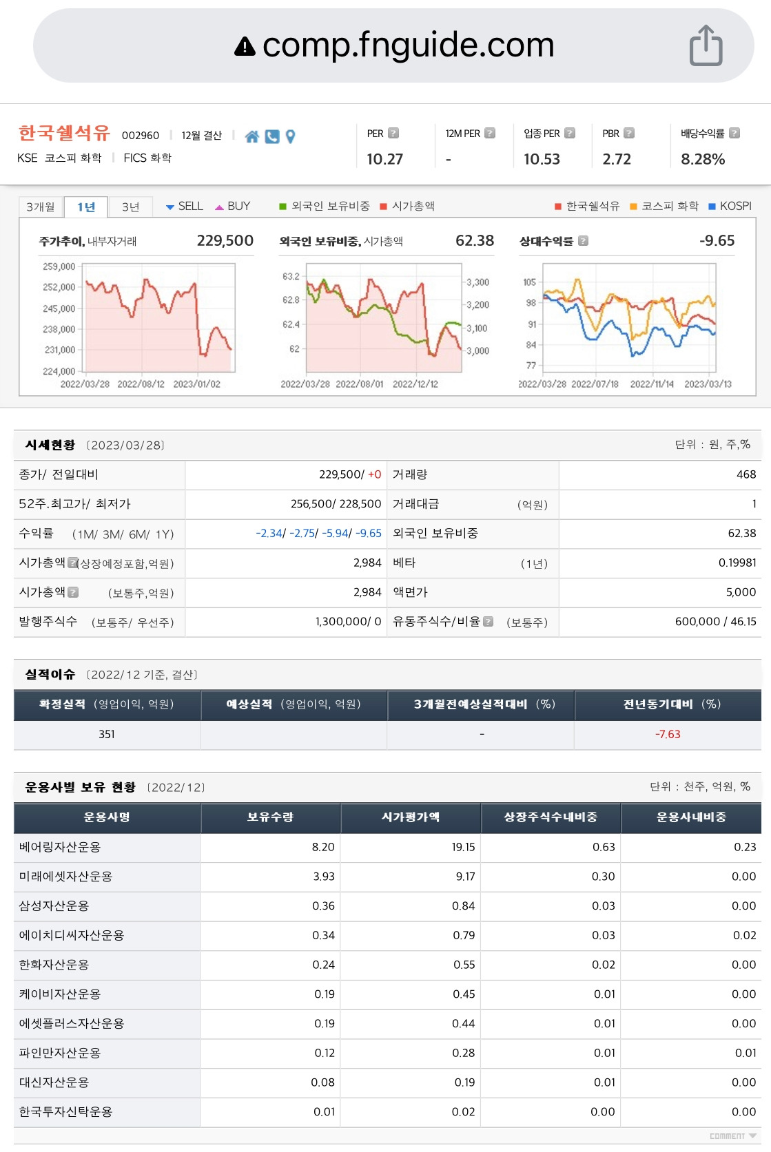 실제 사례로 보자. 과거에 투자했던 한국쉘석유라는 회사다. per가 10.27 정도 나온다. 지금 현재 주가로는 10년 반이 걸려야 원금을 회수한다는 이야기다. 약간 아슬아슬한데 다음으로 넘어가자.