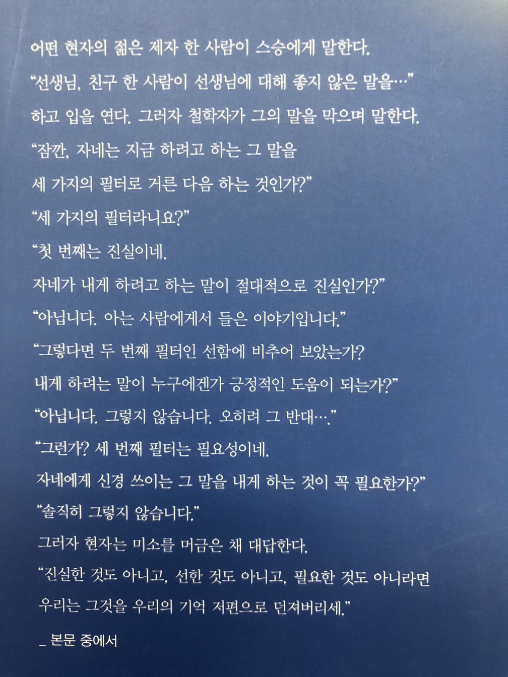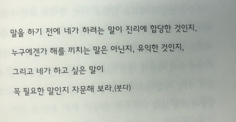 항상 이렇게 대화하려면 아마 한 마디조차 꺼내기 어려울 것이다. 최소한 타인에게 유익한가?라는 하나의 필터만으로도 오해와 문제는 피할 수 있지 않을까?