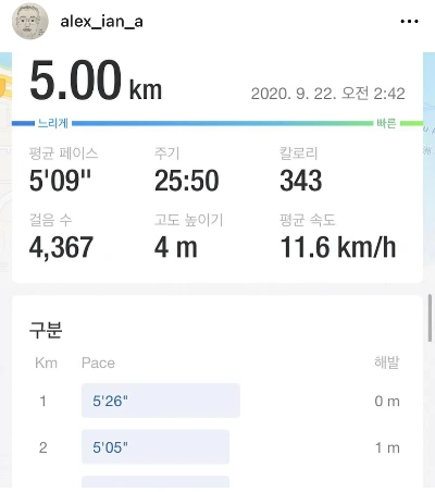 오래간만에 과거에 뛰었던 기록을 생각하며 1킬로미터를 뛰었는데 6분이 넘게 걸렸다. 예전에 5분이면 뛰었던 거리를 그렇게 오랜 시간이 걸린 것도 모자라 숨을 헐 떡 거렸다. 3살이란 나이를 더 먹었고 몸무게도 5Kg은 더 늘었는데도 운동은 오히려 과거에 비해 1/3도 하지 않으면서 과거의 기록이 나오기를 바랐다. 어쩌다 운동하며 1Km를 5분에 뛰어보겠다고 하다가 심장이 터질 듯했다.