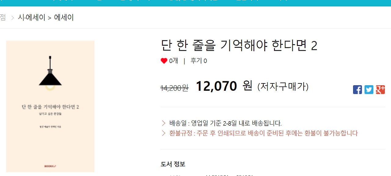 외부 판매가격은 14,200원이지만 저자 구매가로 12,070원에 주문할 수 있다. 배송비 2,500원은 제외된 가격이다. 대략 200페이지 정도의 단행본을 만드는데 들어가는 가격이라고 보면 된다.