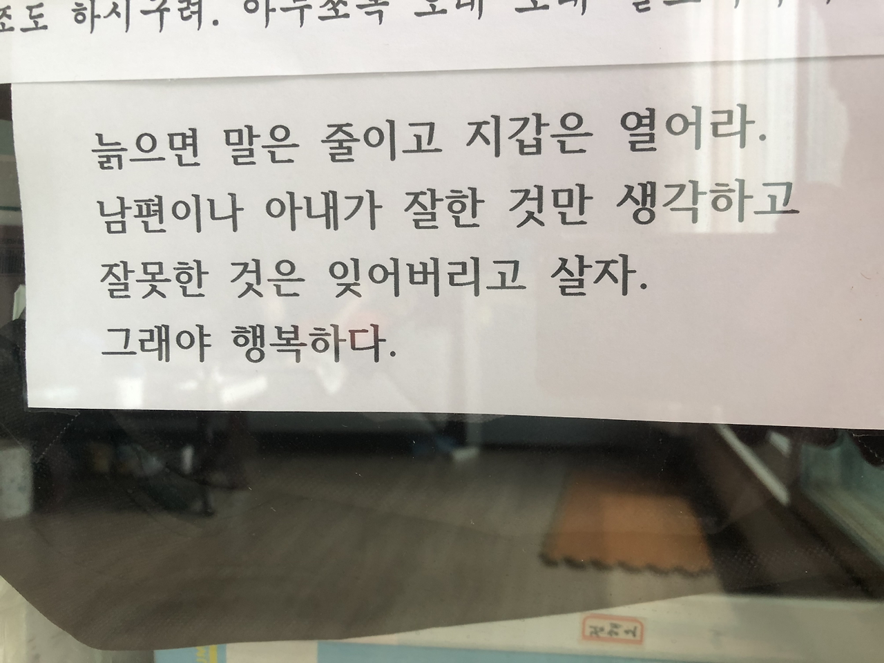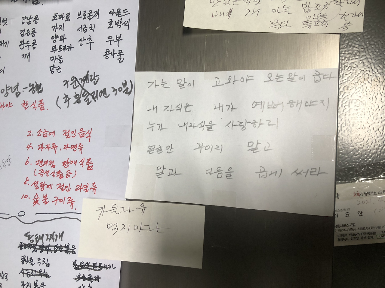 어머니는 음식에 관련된 메모를 하신다. 아버지 역시 하실 것이나 먹지 말아야 할 음식을 적어 놓으신다. 어머니가 본인을 위해서 적은 것인지 모를 메모가 인상적이라 적어보다.