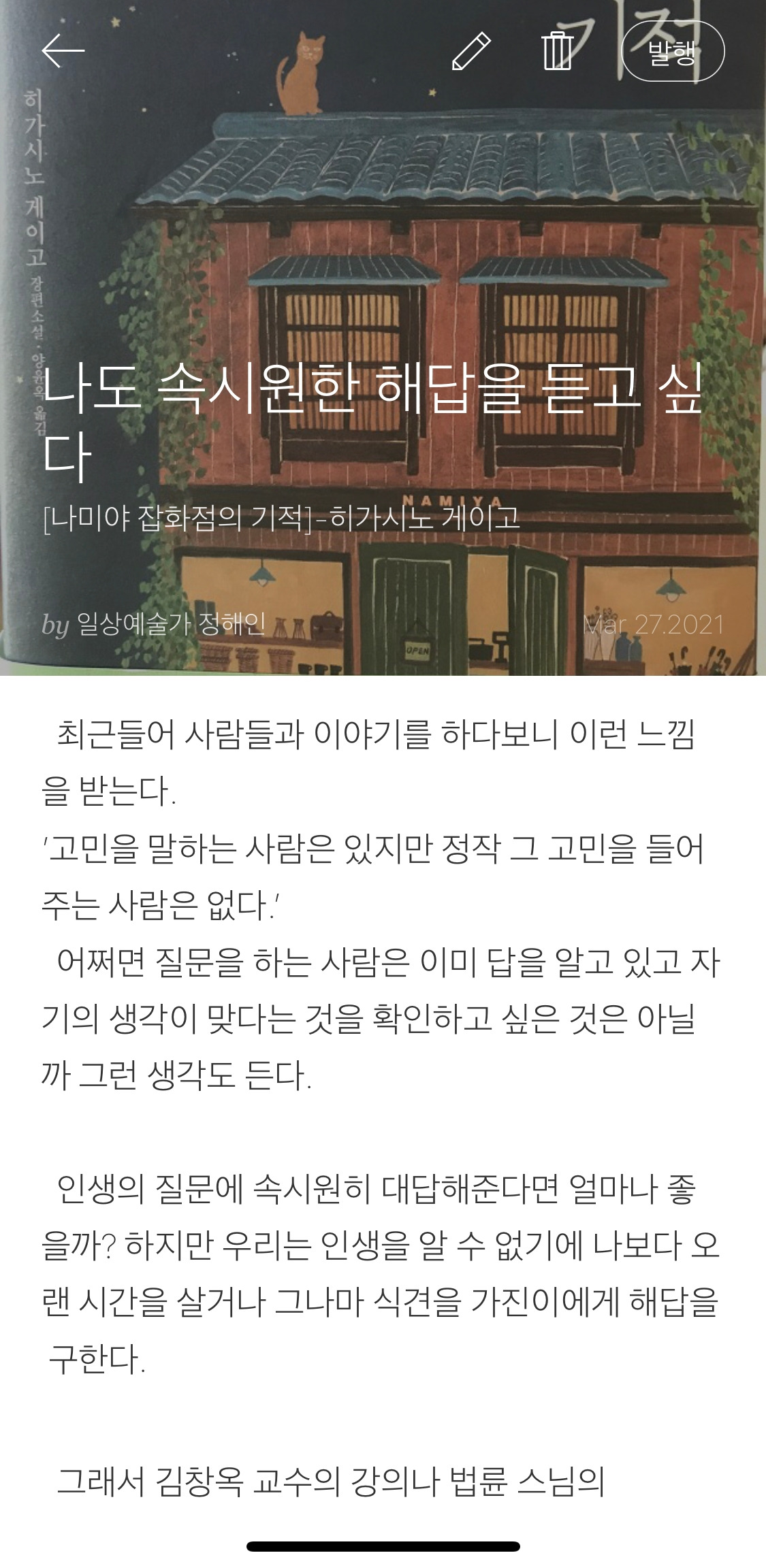 히가시노 게이고의 소설을 읽으며, 마음의 답답함에 대해 써보려 했지만 무언가 가슴에 막힌 듯한 느낌이 들어 더 이상 내용을 적지 못했다.