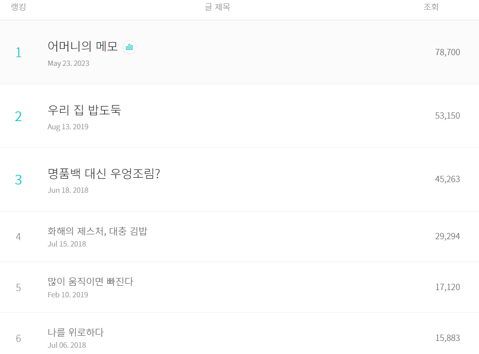 이 글이 내 소원은 이루어주었다. 에세이로 내 브런치에서 조회수 1위 하기. 남들에게 요리 블로거가 아니라 에세이 작가라고 이야기해도 되겠다. 다시 이 기록을 언제쯤 깰 수 있을까? 최소 1년은 지나야 가능하려나? 10만이나 100만 조회수의 길은 아직 나에게 멀고도 험해 보인다.