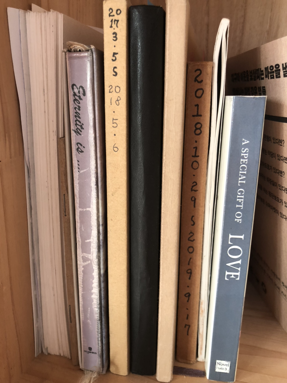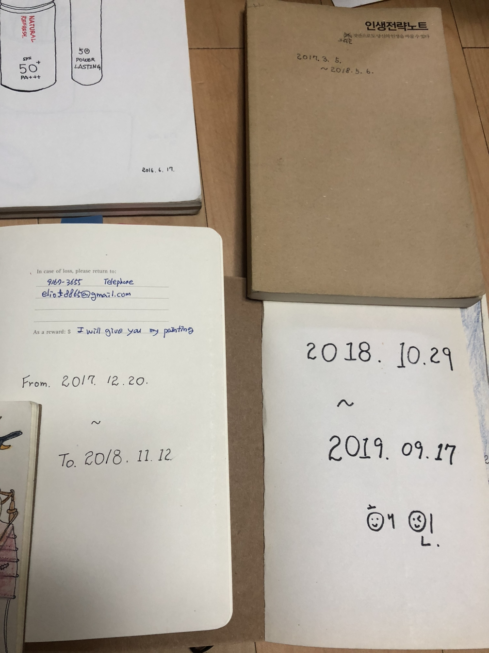 집에 굴러다니는 줄이 없는 노트도 괜찮습니다. 집에 장기간 방치되었던 다이어리어와 책 부록으로 받은 노트에 그리기도 했습니다.