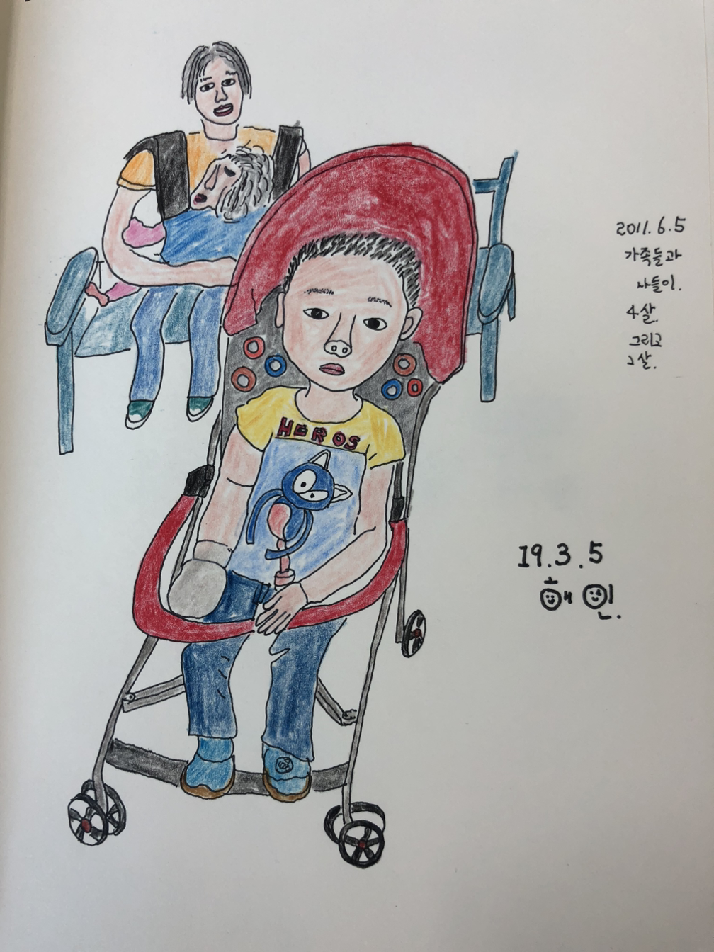큰 아이가 4살이었을 때 유모차에 탔던 아이를 그렸는데 돼지코로 그렸습니다. 사람 코가 아니라 돼지코라고 아들이 뭐라 하더군요.