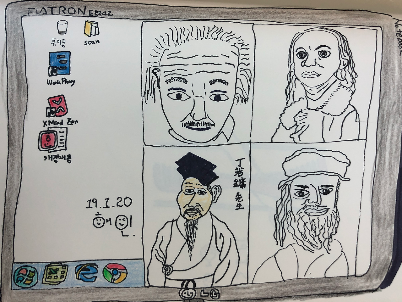 예전에 제 컴퓨터에 있던 4명의 위인입니다. 아인슈타인, 벤자민 프랭클린, 정약용 선생, 레오나르도 다빈치입니다. 인물화가 아니라 추상화가 제게 맞는 주제일까요?