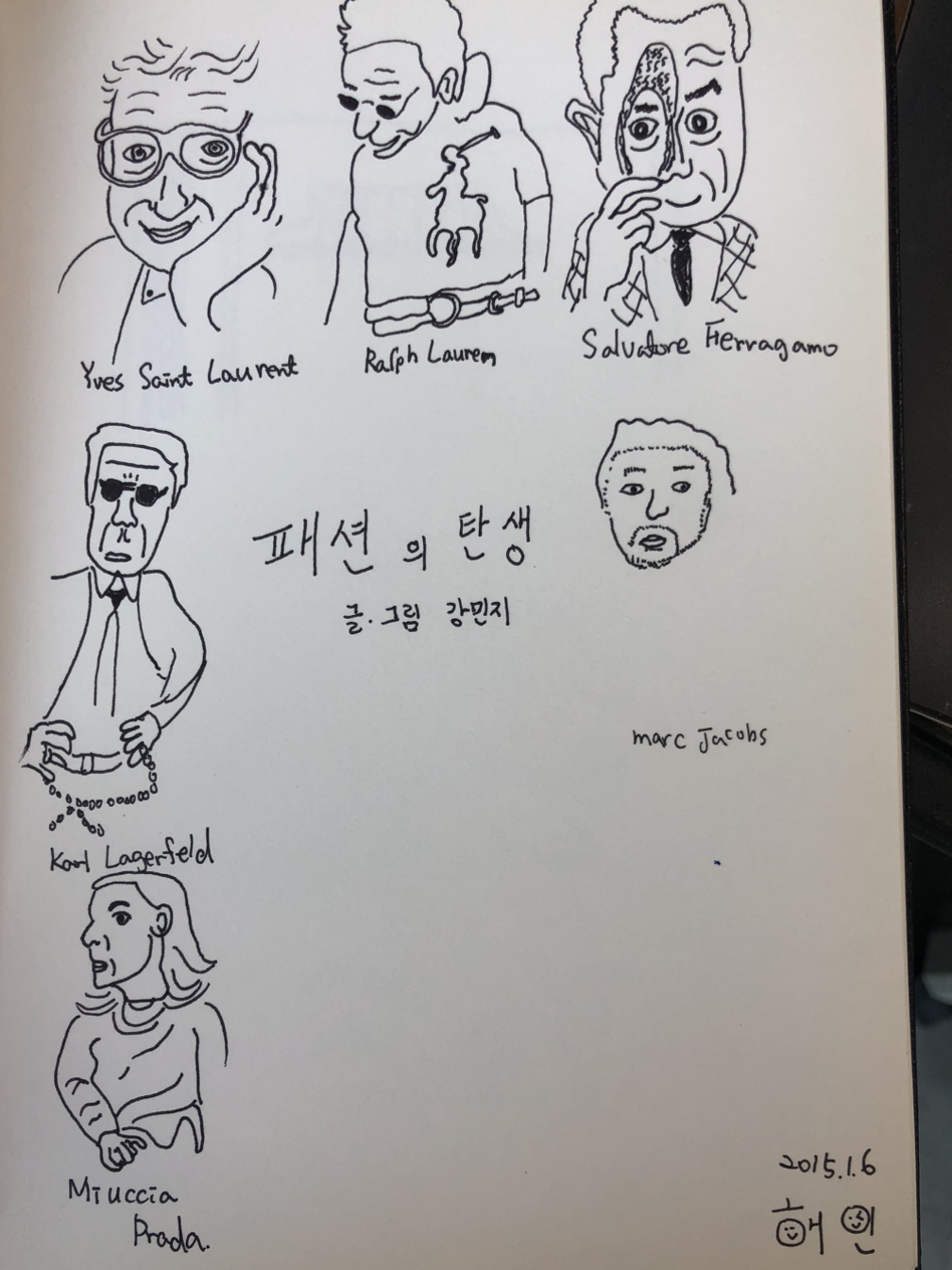 패션의 탄생이라는 책입니다. 패션 대가들의 사진이 그려져 있는데 제 나름대로 얼굴을 망쳐서 그렸습니다. 그리다가 도무지 너무 다른 사람이 그려져서 그리다가 포기했습니다.