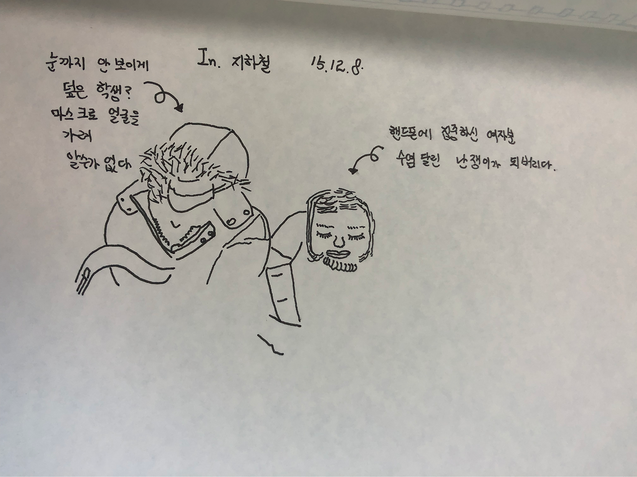 지하철 맞은편에 있는 사람을 그리다가 얼른 덮었습니다. 혹시 이 그림을 보고 항의를 하면 어쩌죠?