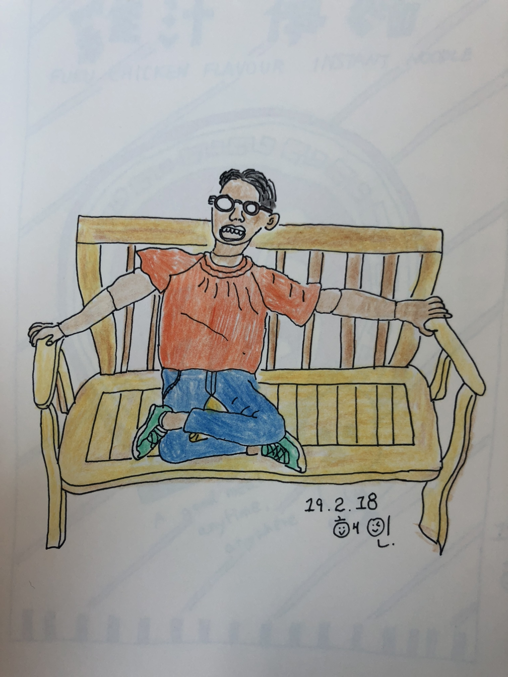 딸이 욕했던 그림 중 하나네요. 의자를 전부 차지하겠다고 팔을 벌린 딸을 그렸는데 딸이 말하기를 아빠는 딸을 못생기게 그리는 재주가 있답니다.