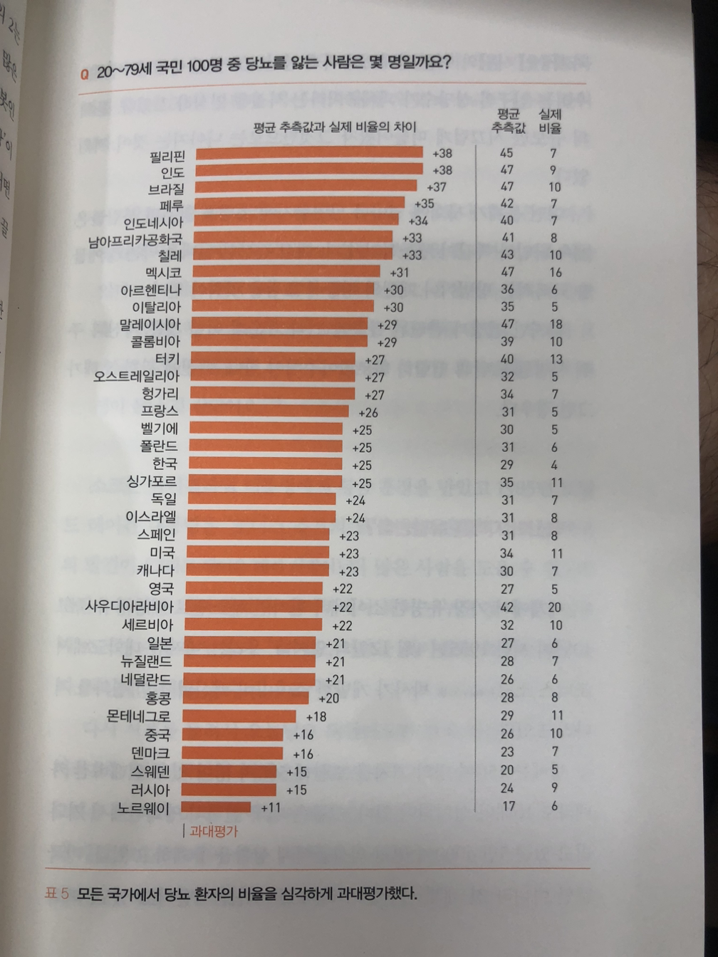 아까 말씀드린 당뇨 비율을 말씀드릴게요 정답은 4%입니다 무려 25%나 과대평가네요. 대부분의 나라가 실제보다 과대하게 답변했습니다. 필리핀은 오답률이 38%나 높습니다. 여론조사대로라면 필리핀 사람 절반이 당뇨 환자여야겠네요.
