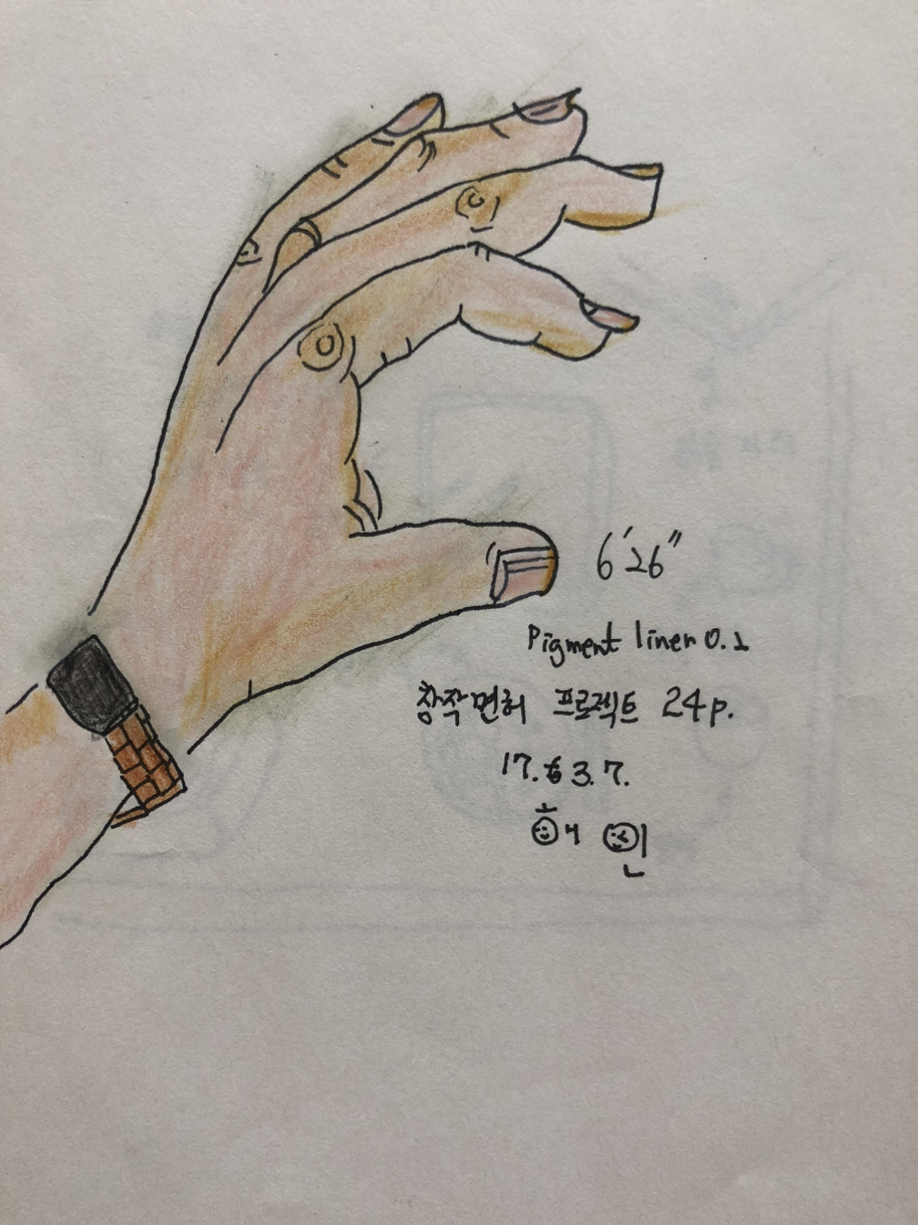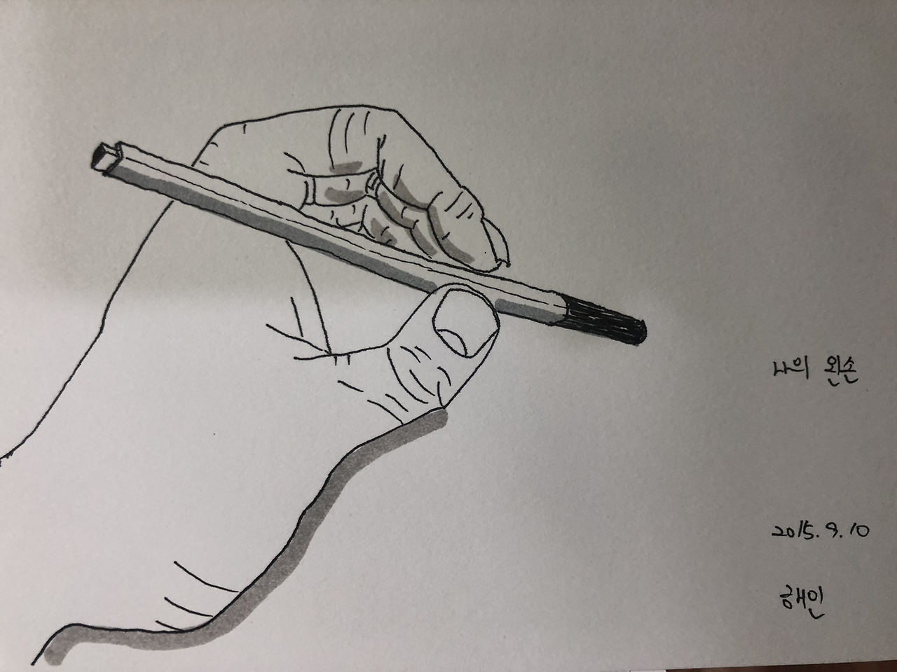 손가락을 너무 펴서 그런 걸까?라는 고민에 왼손에 펜을 쥐어봅니다. 손가락에 이렇게 주름이 많았나 싶지만 눈에 보이는 몇 개만 그려봅니다.