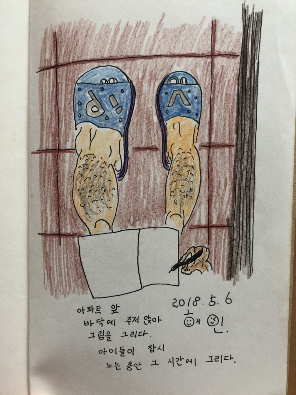 아이들이 놀이터에서 잠시 노는 동안 잠깐그림을 그려봅니다. 급하게 그리느라 다리가 원시인처럼 그려졌습니다. 그래도 언젠가는 사람 다리처럼 그려지는 날이 오겠죠?