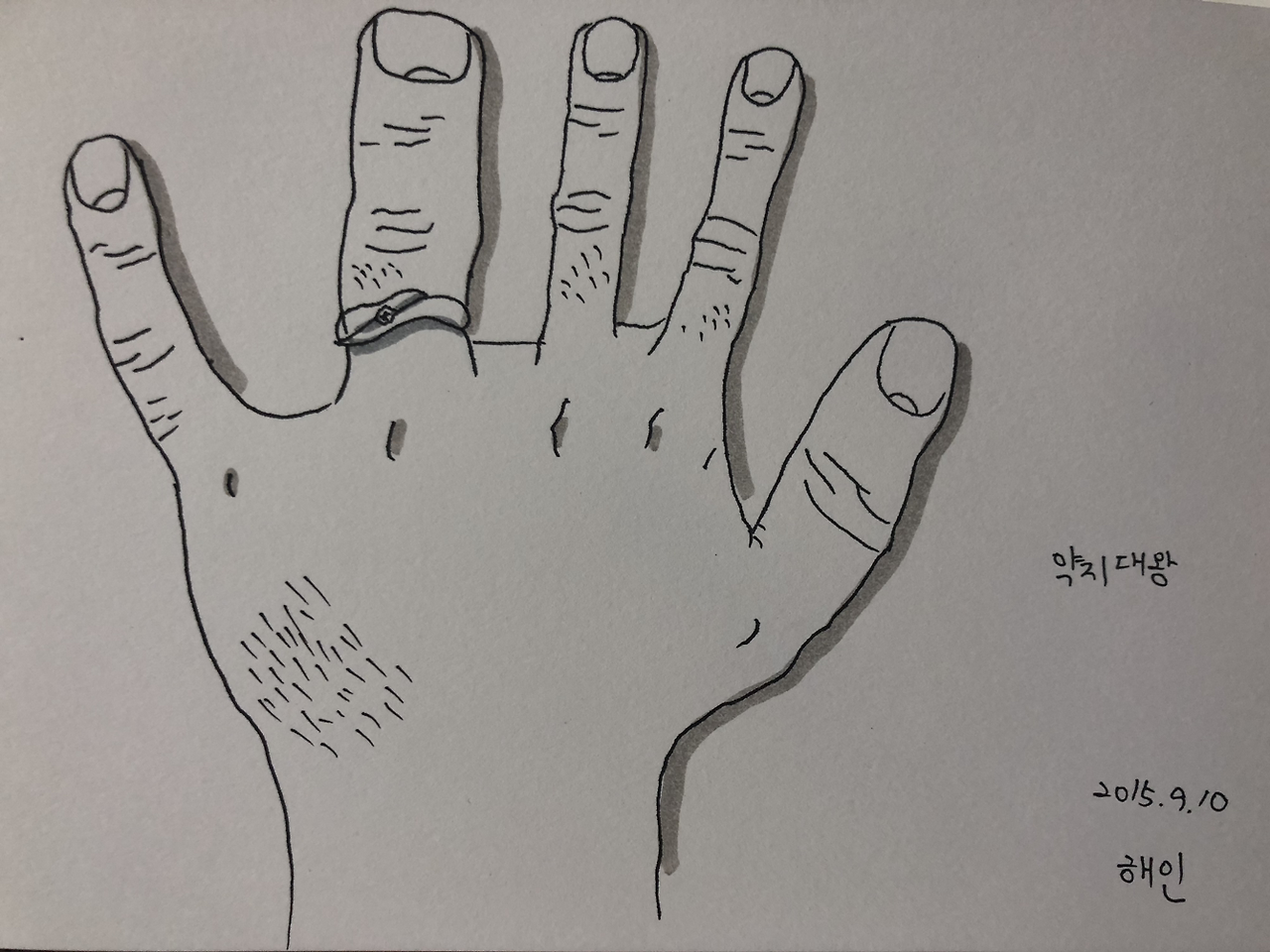 약지대왕이라는 제목을 붙인 그림입니다. 저의 약지는 사실 저렇게 크지는 않습니다. 손가락이 저만큼 벌어지지도 않지요.