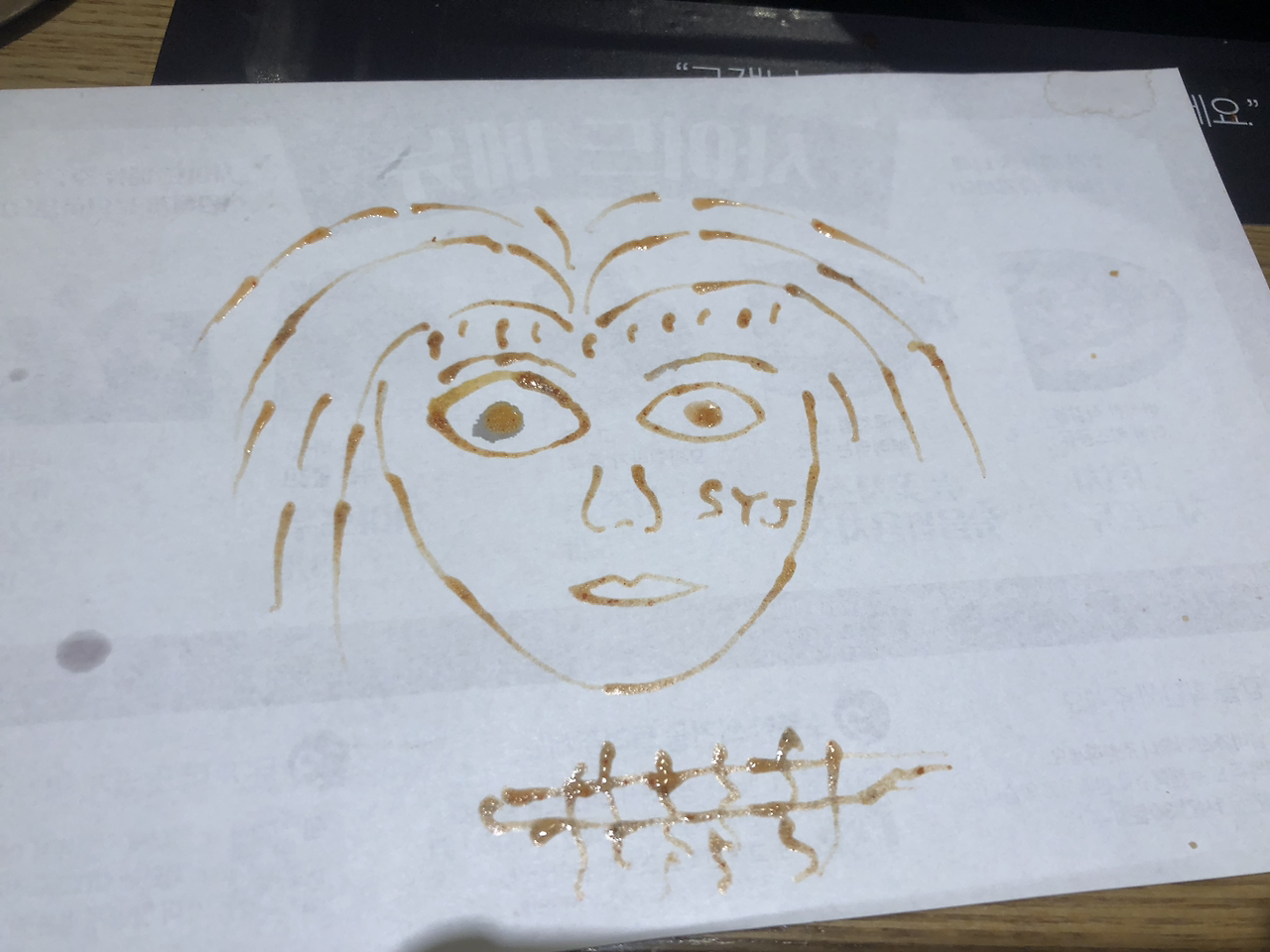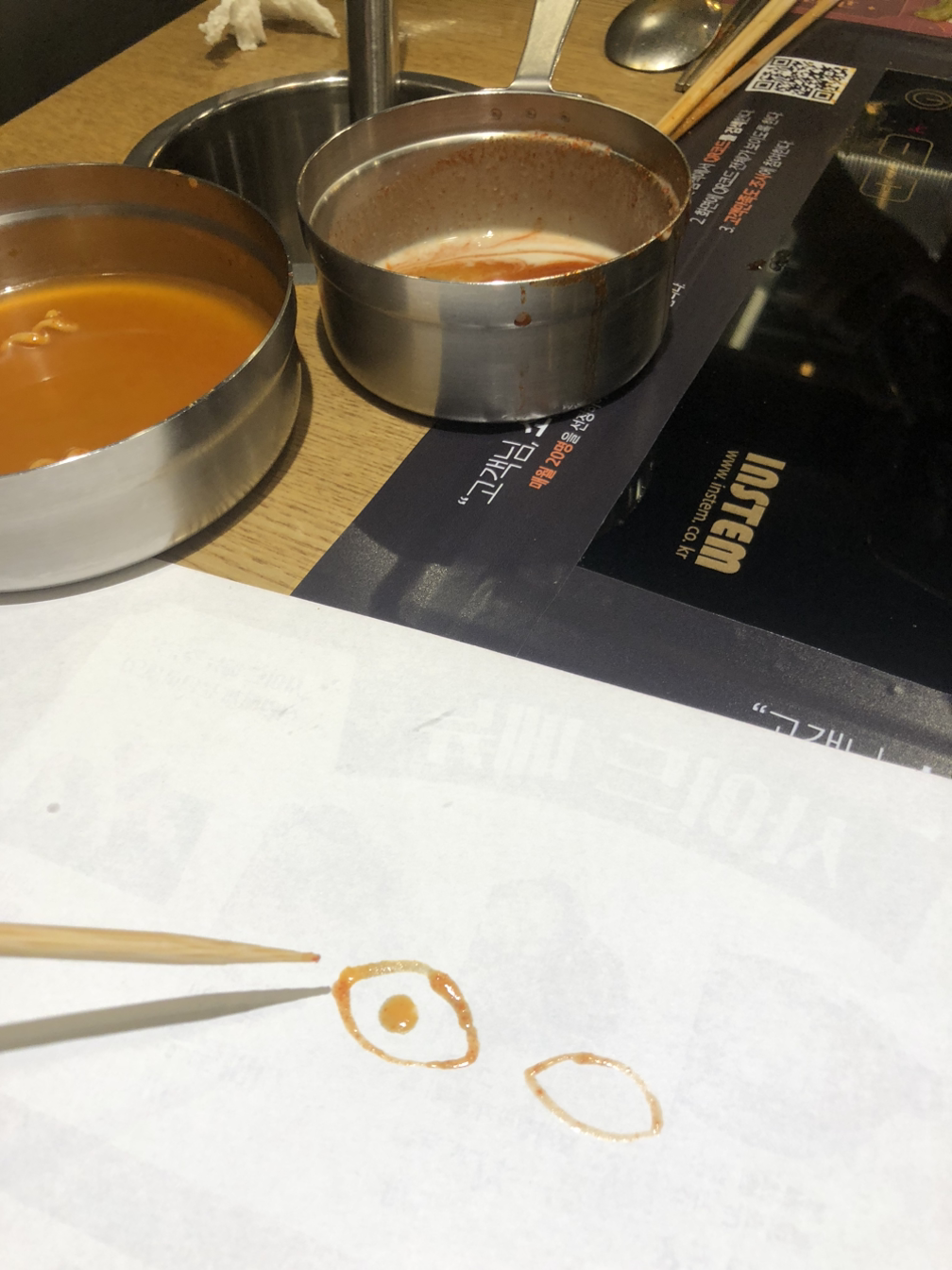 꼭 펜으로만 그림을 그려야 하는 건 아닙니다. 다 먹고난 떡볶이 국물과 오뎅 꼬치로 그림을 시작합니다. 오뎅 꼬치를 펜 삼아 흰 종이에 그림을 그립니다.