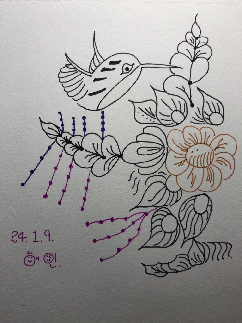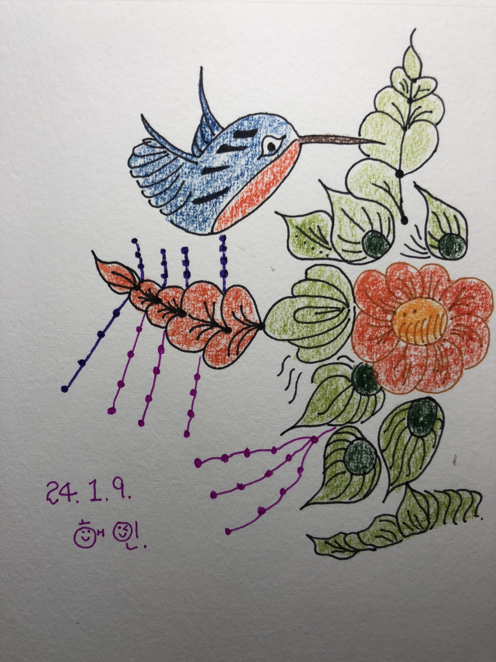 그분의 작품은 꽃과 새가 어우러진 원시적인 느낌이 인상적이었습니다.