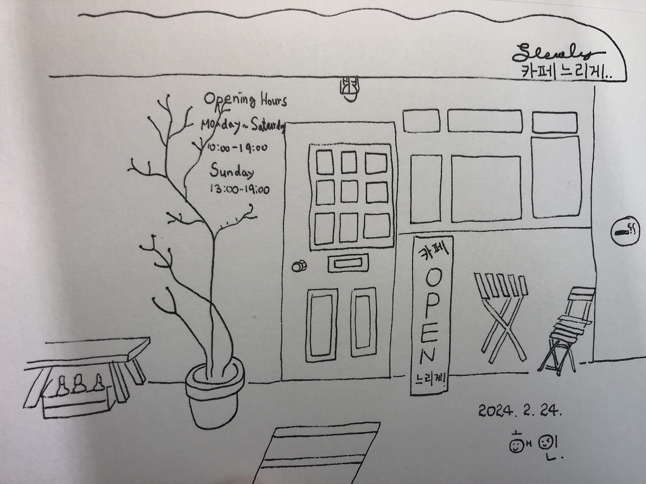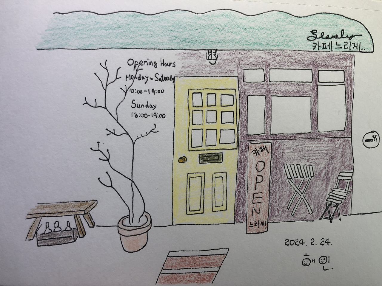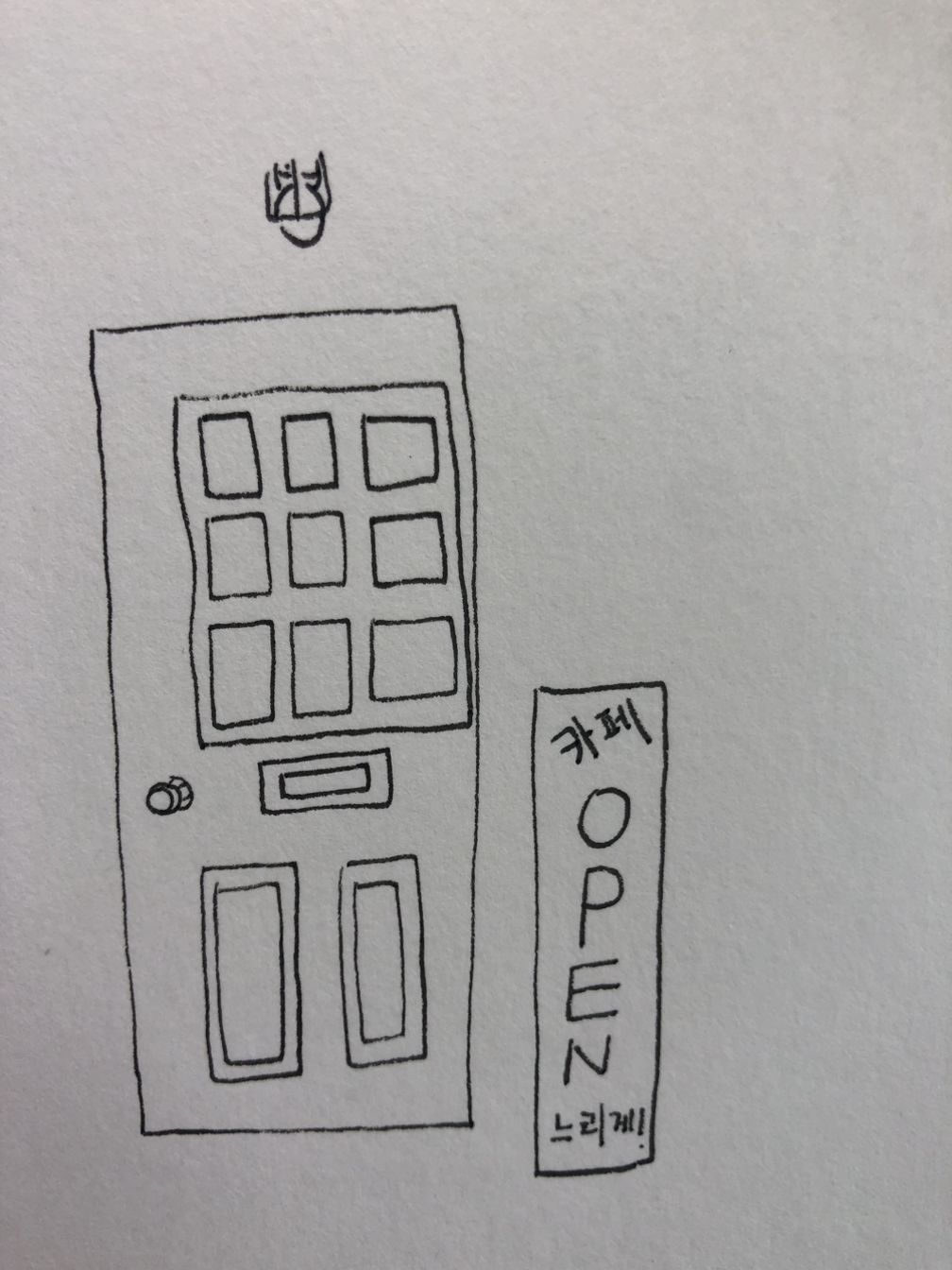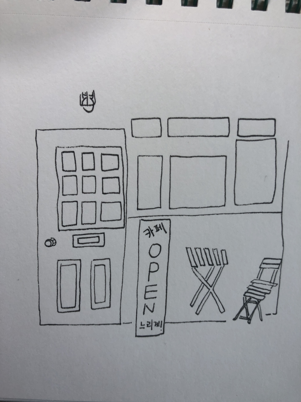 카페 느낌에 따라 색깔을 칠해 봅니다. 원래 간판의 진한 느낌은 잘 나지 않는군요. 그렇게 오늘의 그림은 끝이 납니다.