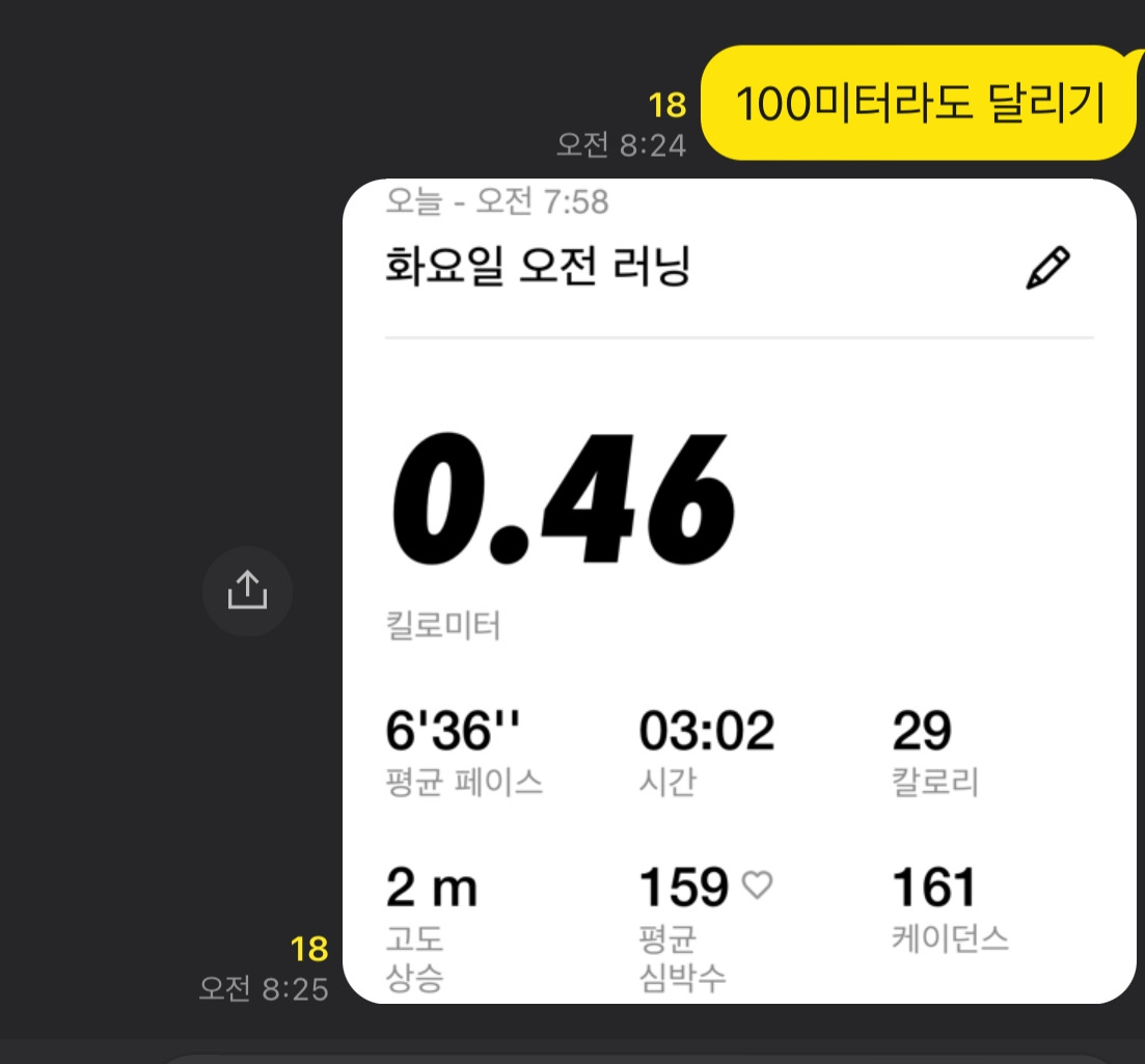 습관을 계속하려면 함께 해야 오래 할 수 있습니다. 습관 단톡방에 달리기를 올립니다. 남들은 5km, 8km씩 달립니다. 누가 잘 달렸나 비교를 하기 위한 방이 아니라 서로 응원하며 격려하기 위해 올리는 방입니다. 그렇게 부끄러운 기록을 올려 봅니다.