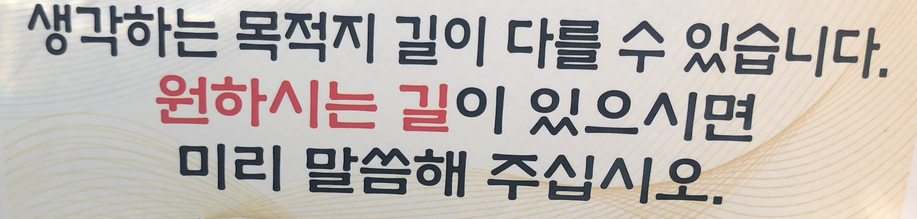 좌석에 앉자마자 오른쪽 차문 벽면에 문구가 붙어 있었습니다. 사람마다 원하는 길이 다르기에 기사님은 미리 붙여놓지 않았을까요? 네비에 나온 길을 따라 보통 가시지만 원하시는 길이 있는지 물어보시더군요. 우선은 네비대로 가달라고 했습니다.