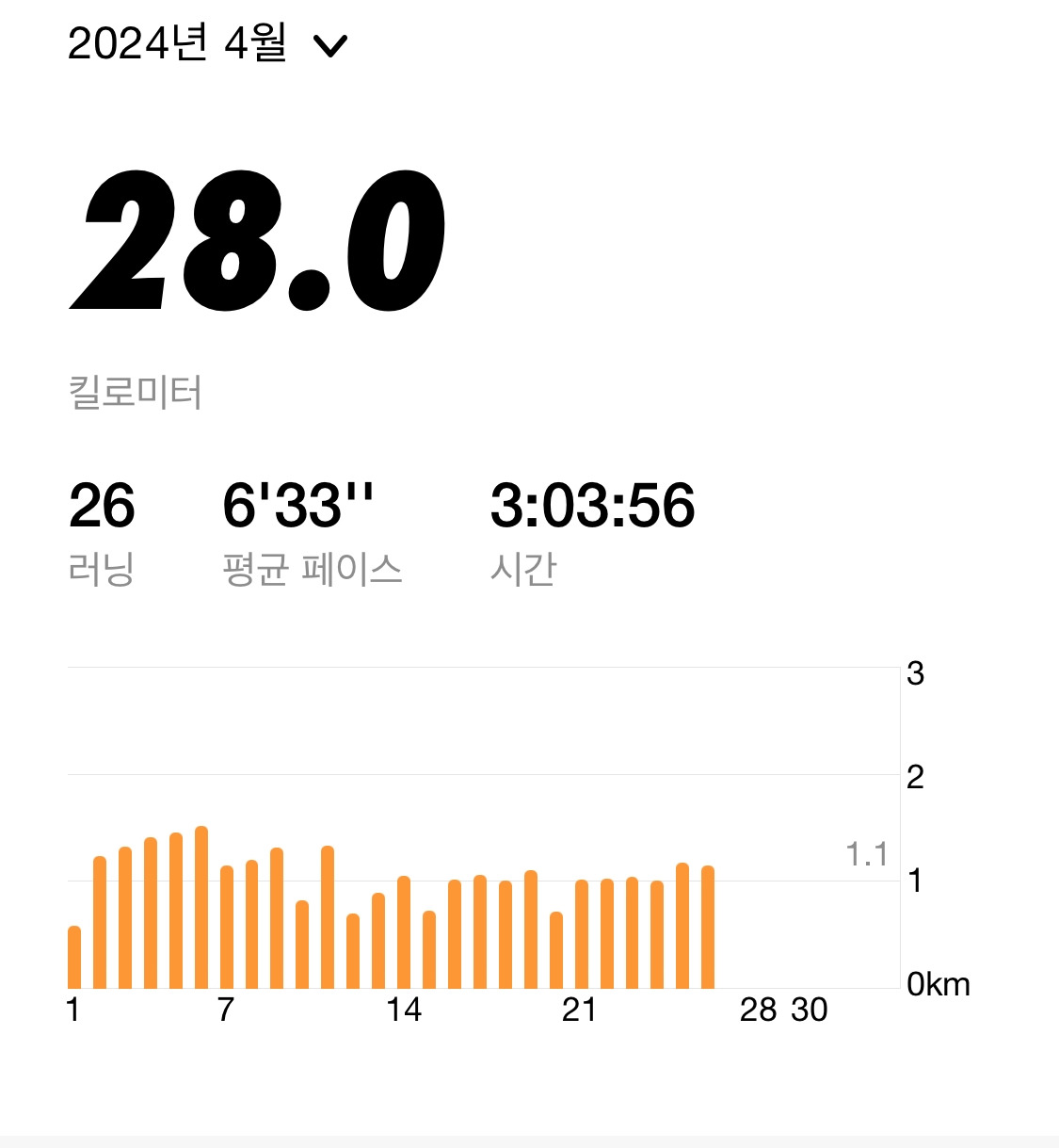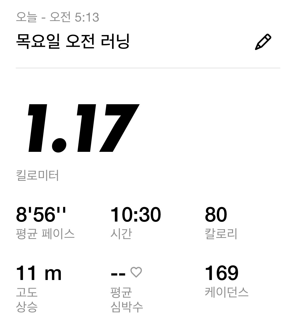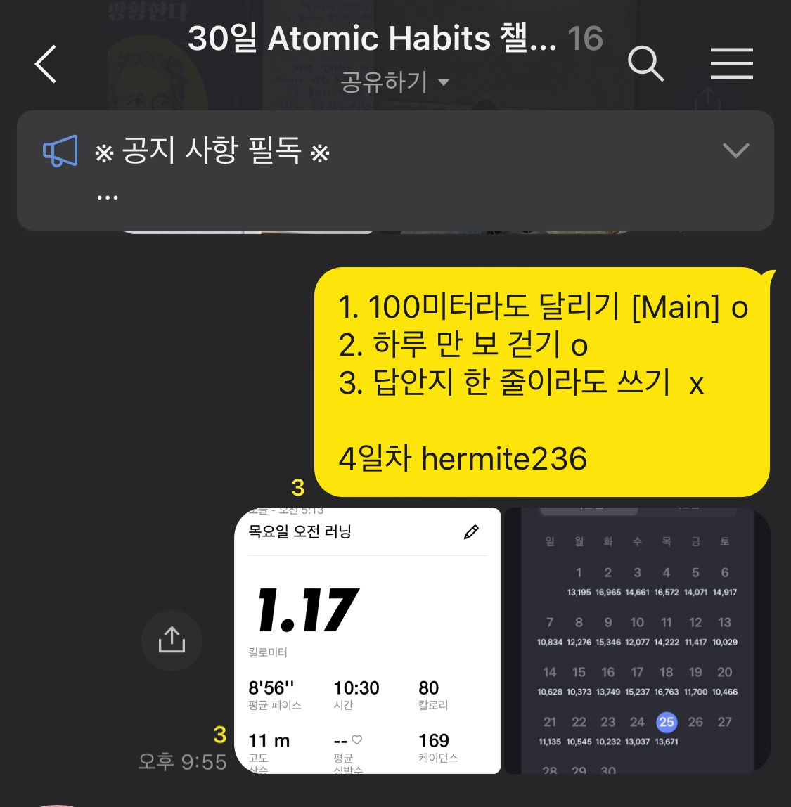 오히려 이번 달에는 멀리 달리기보다는 하루라도 빠지지 않고 달리는데 신경을 쓰고 1km라도 매일 달리자고 저와 약속을 했습니다.