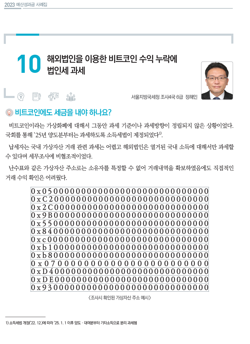 오늘 올릴 이야기는 일상예술가 콘셉트에는 맞지는 세금 이야기입니다. 과거에 제가 가상자산에 대해 세무조사를 했었습니다. 해당 조사 사례가 기획재정부 예산성과금을 수상하게 되었네요. 우수 사례로 선정되어 사례집 책자에도 실리게 되었습니다. 지금은 비록 국세청 직원이 아니지만 서울지방국세청 조사4국에서 열심히 살았던 과거 제 모습을 잠시 떠올려 보게 됩니다.