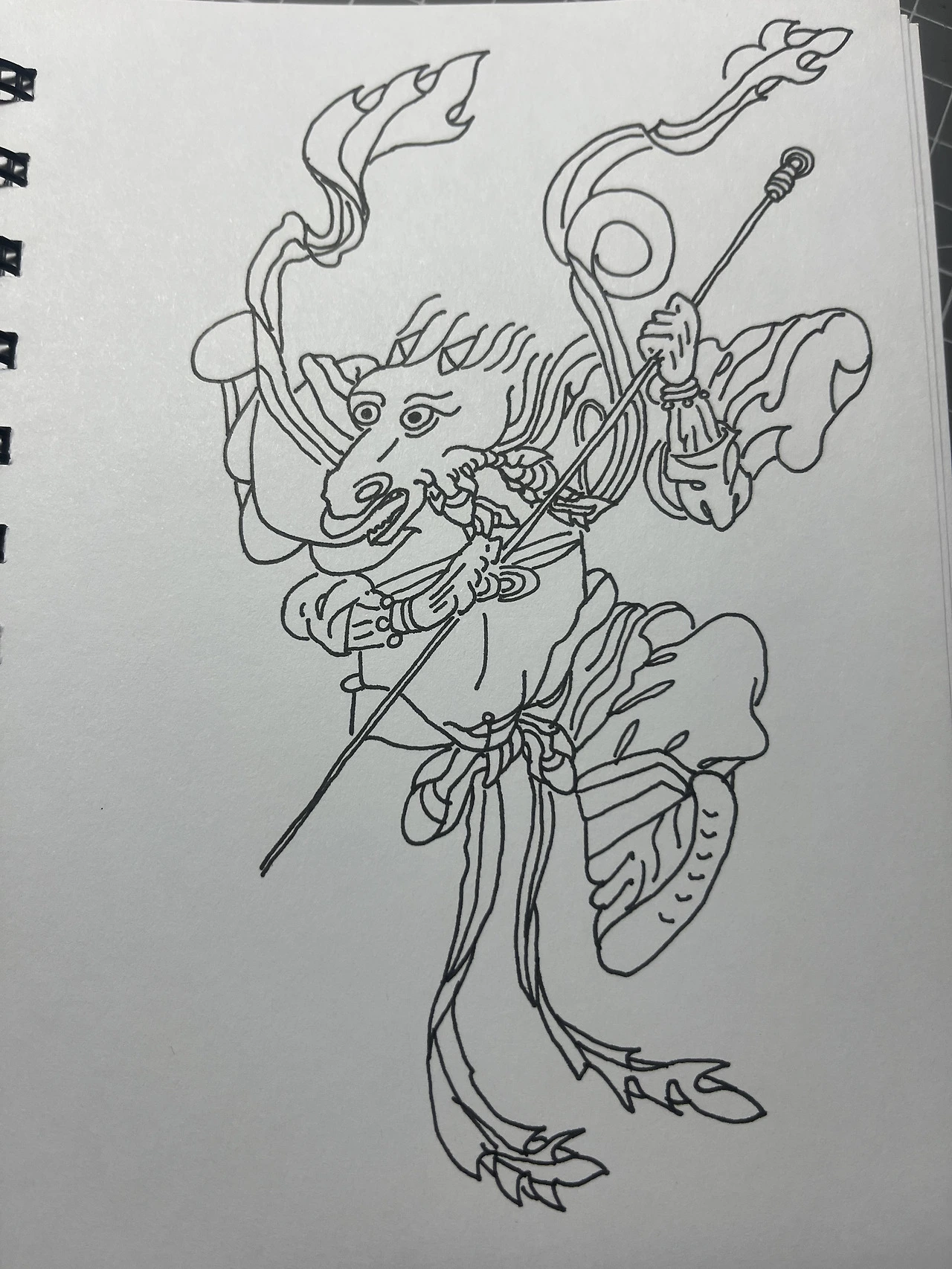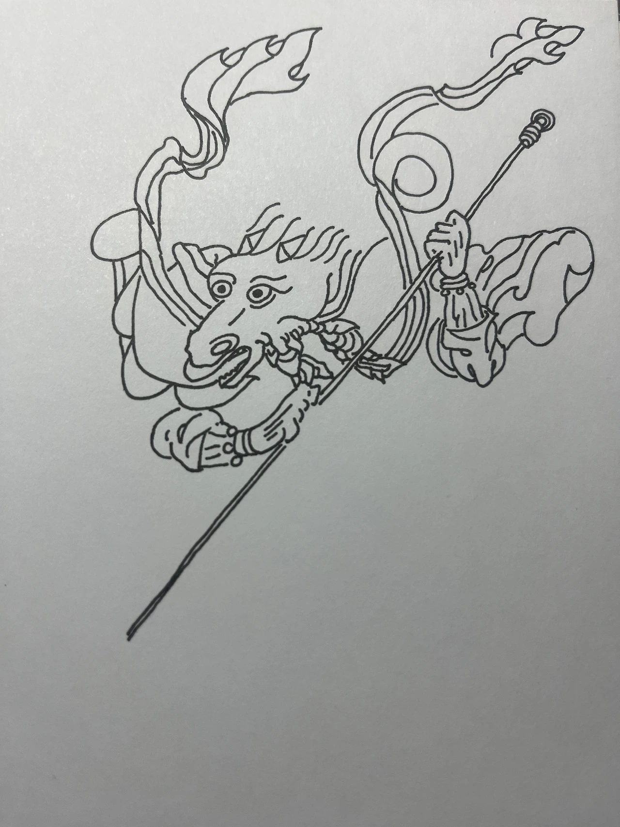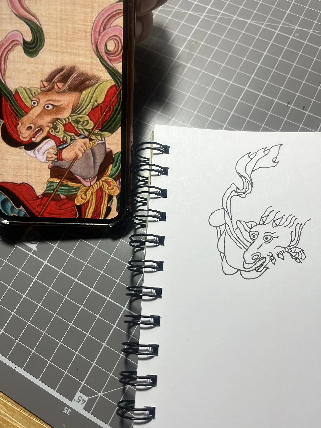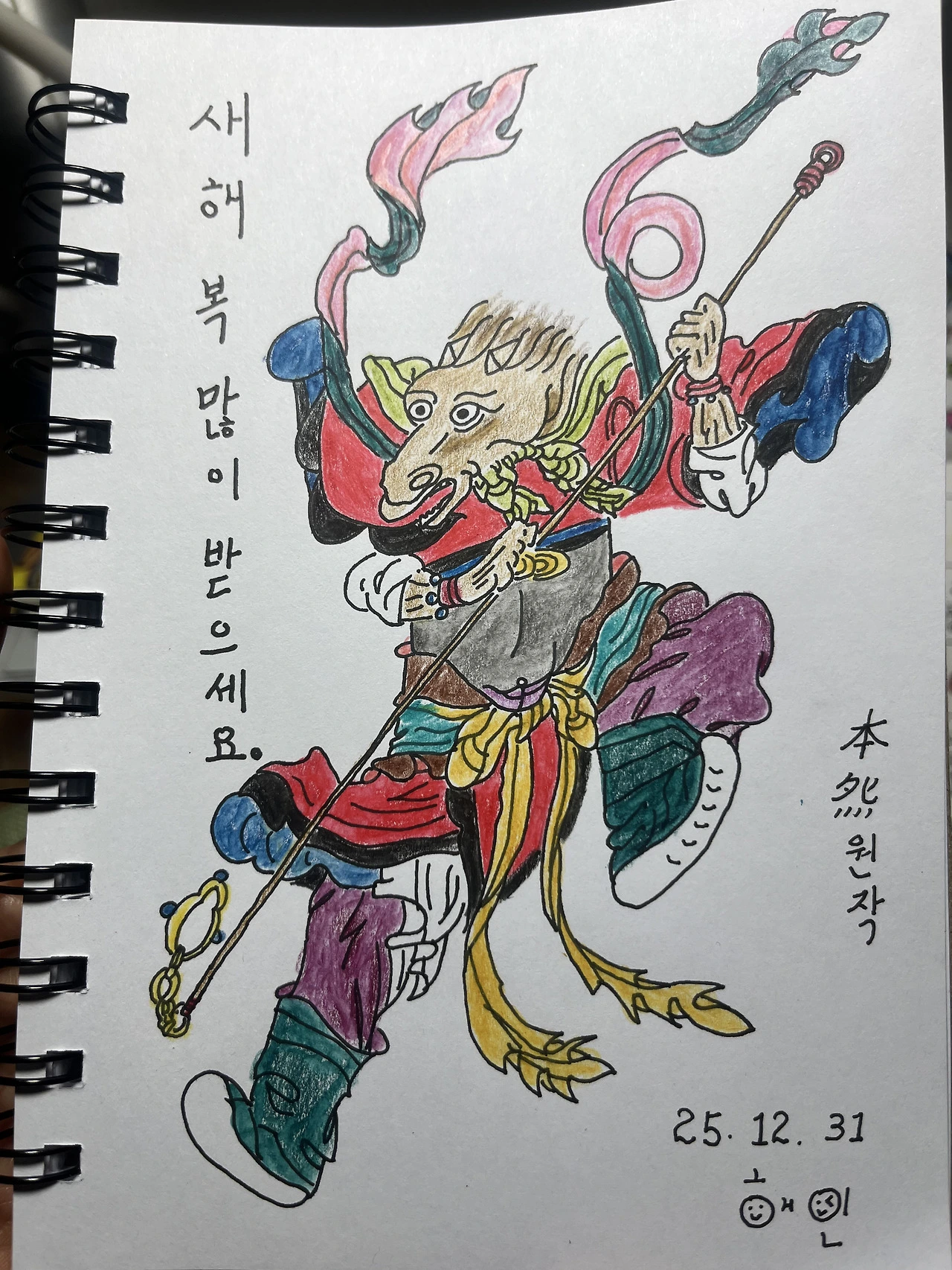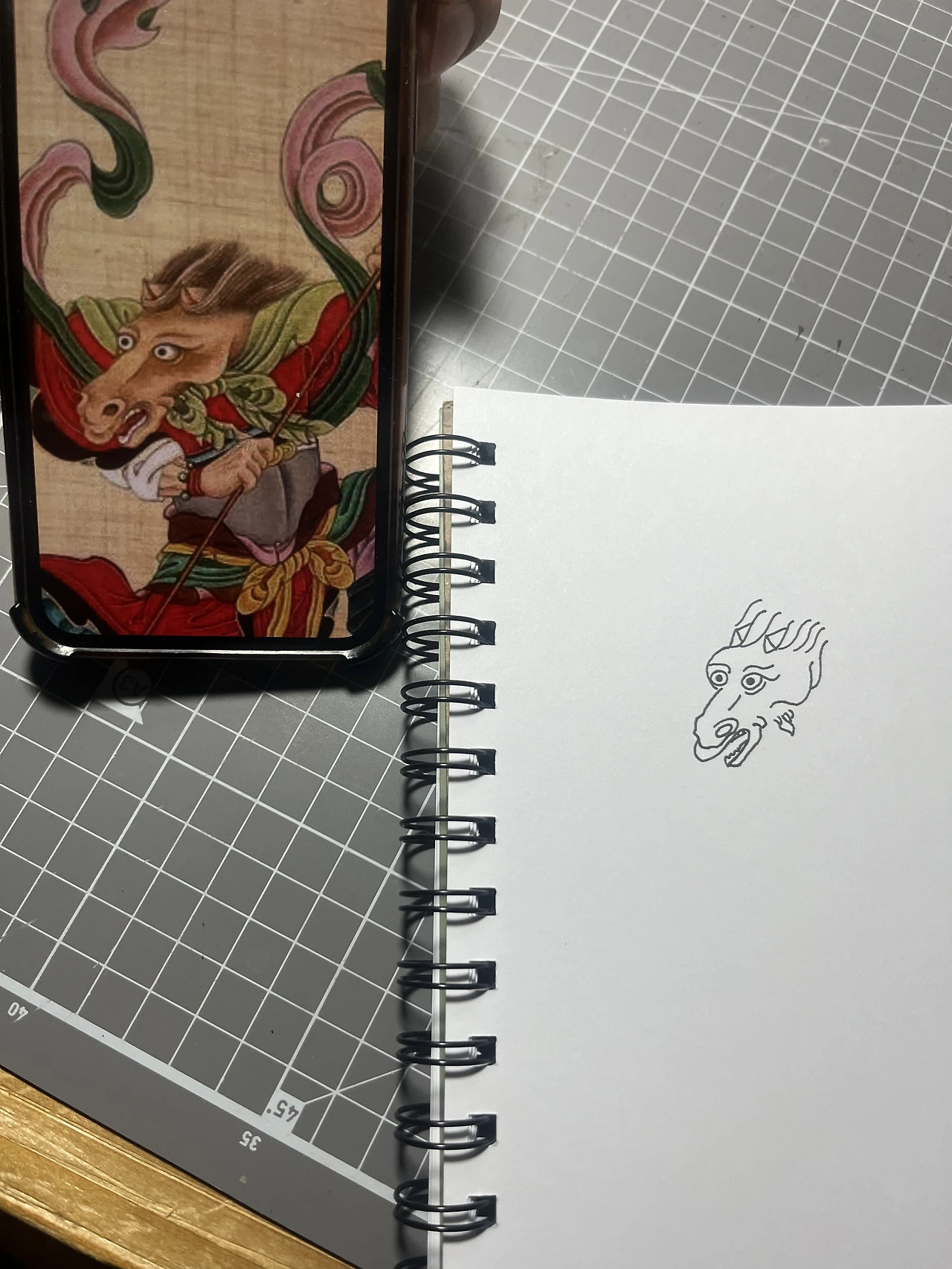 올해도 역시 본연 스님의 말 그림을 보고 따라 그리기 시작했습니다. 예전에 저장해둔 스님의 십이지신 그림을 찾아서 핸드폰 화면에 원본 사진을 띄워놓고, 스케치 펜을 쥐고 말머리부터 천천히 시작해 봅니다.