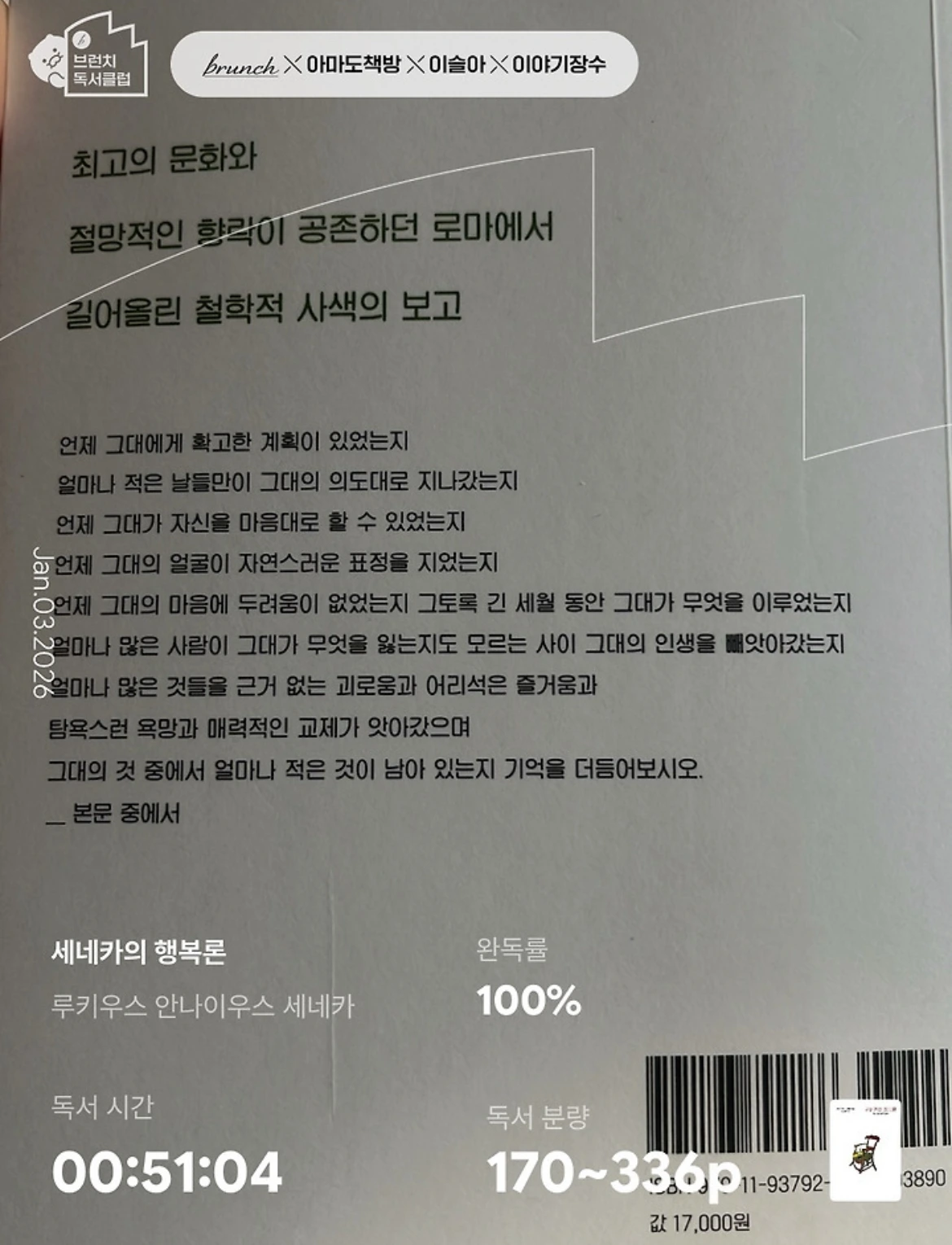 행복은 무엇을 더 가져서 얻는 것이 아니라, 무엇을 하지 않아도 되는 상태에서 오는 것이 아닐까? 무리하지 않고, 과도하게 욕망하지 않고, 스스로를 혹사시키지 않는 삶. 세네카가 말한 행복 역시 결국 이런 것이 아니었을까라는 생각을 해 본다. 더 누리려 하지 않고, 더 쥐려 하지 않으며, 자연의 섭리를 그대로 받아들이는 태도.